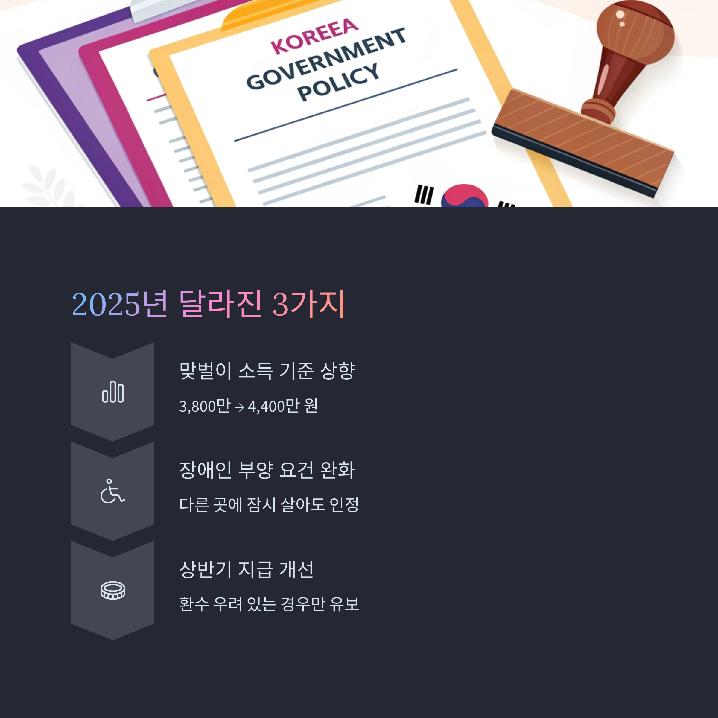- 맞벌이 가구 소득 기준 상향 (3,800만 → 4,400만 원)