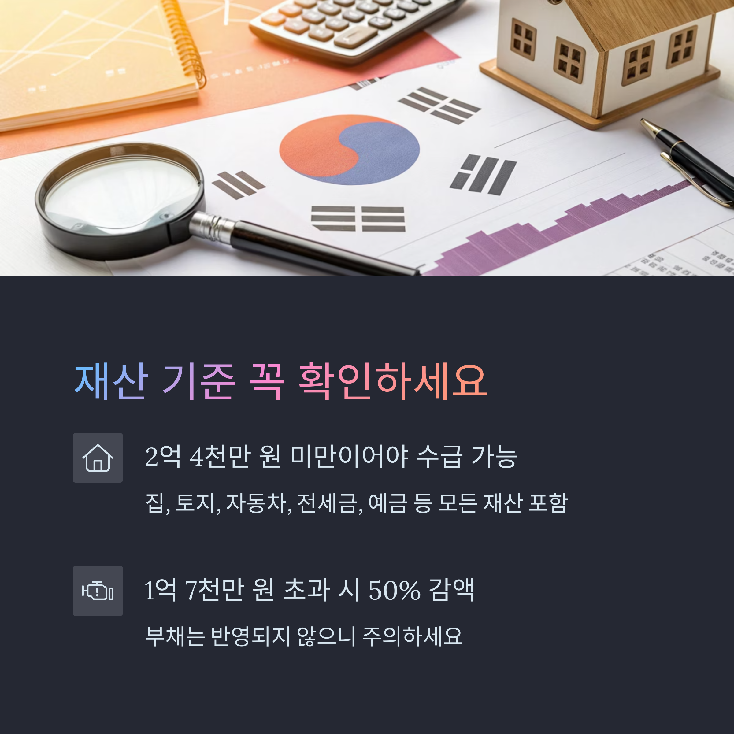 - 단, 재산이 1억 7천만 원을 넘으면 지급액의 50%가 자동 감액
