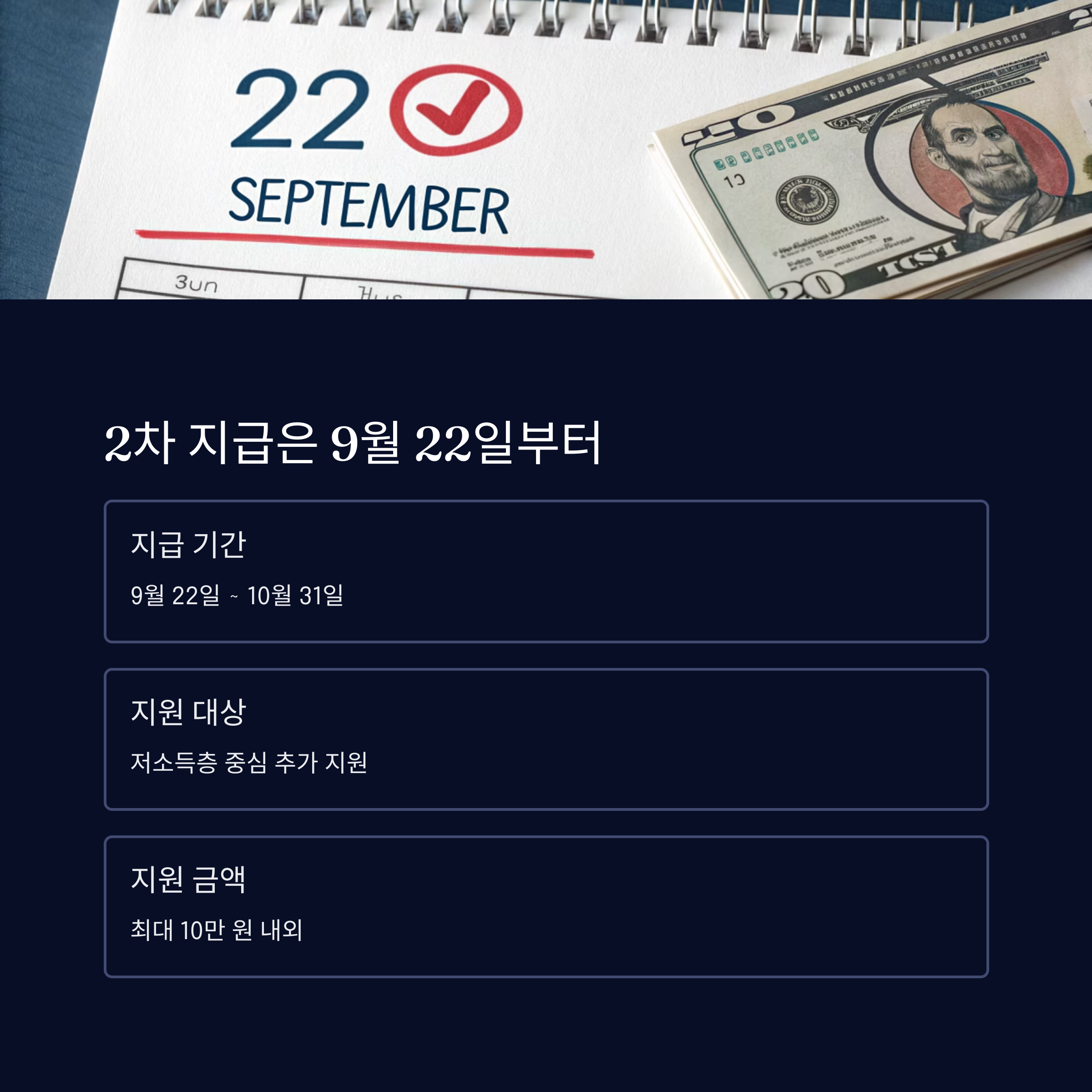 2차 지급은 9월 22일부터 10월 31일까지입니다. 이 단계는 1차 지급 이후 저소득층을 중심으로 한 추가 지원이며, 금액은 최대 10만 원 내외입니다. 대상자는 별도 공지 예정이며 신청 요건을 다시 확인하는 것이 중요합니다.