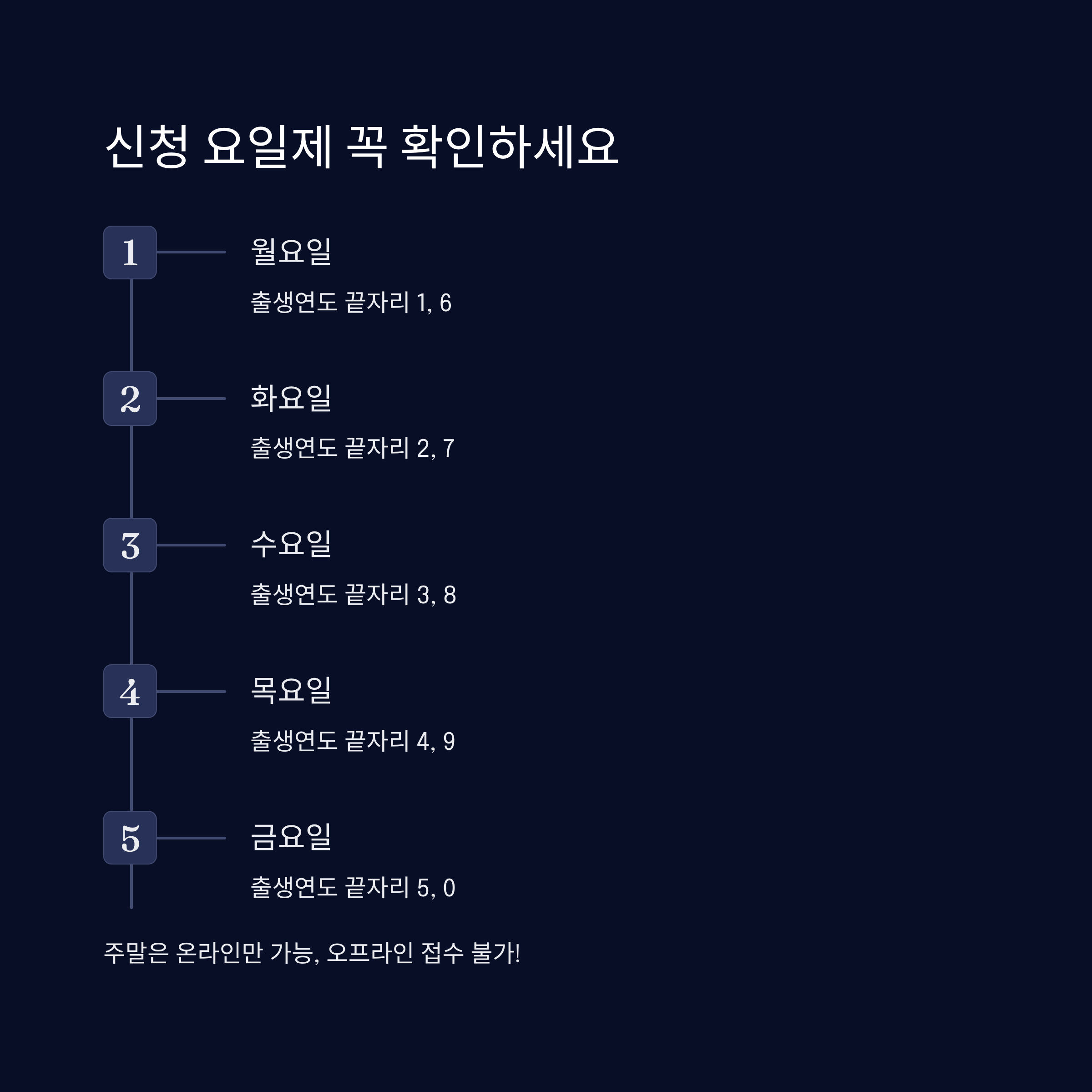 신청 첫 주(7월 21~25일)는 출생연도 끝자리에 따라 요일제가 적용됩니다. 주말은 온라인만 가능하고 오프라인 접수는 불가하니 평일 요일을 꼭 확인하세요.