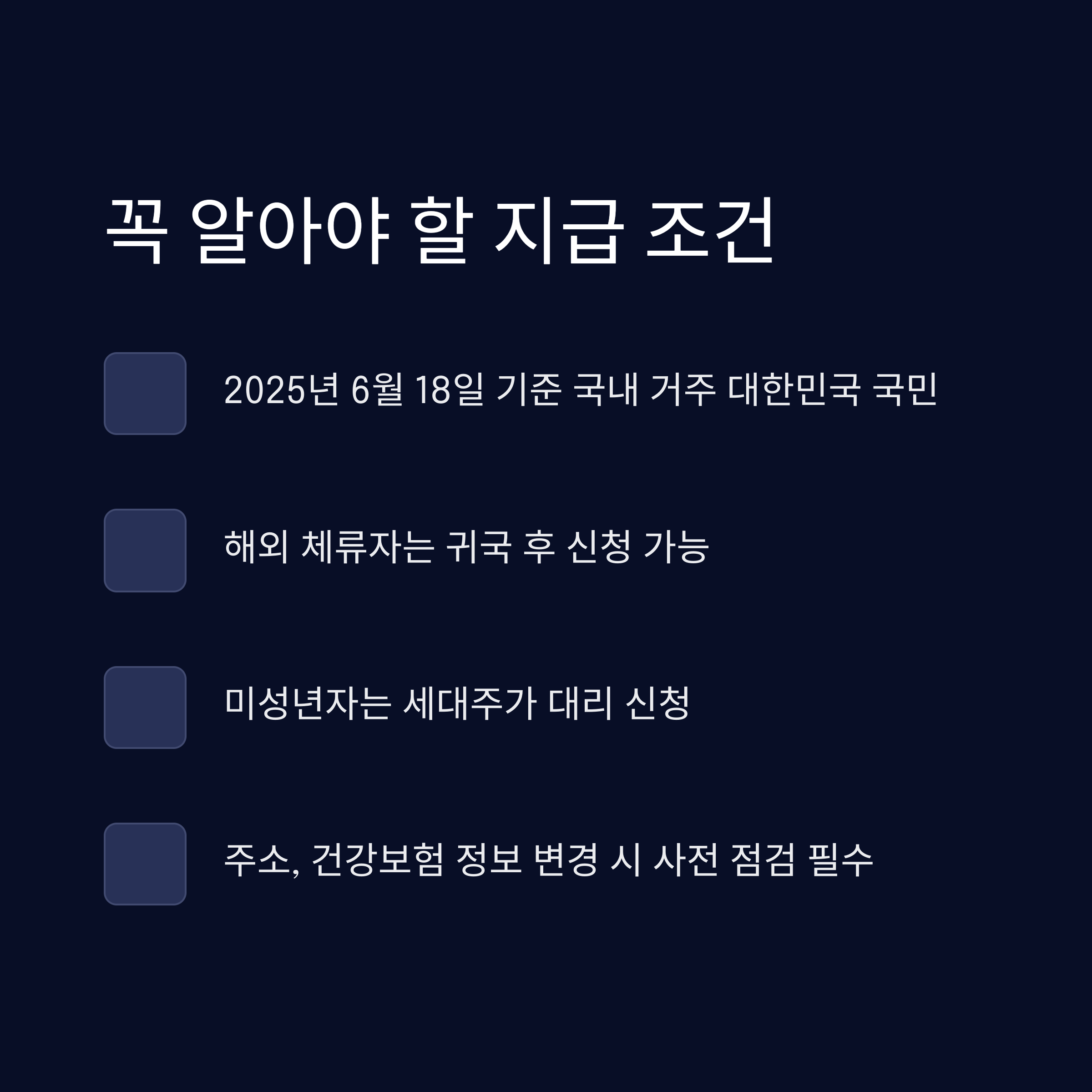 2025년 6월 18일 기준 국내에 거주 중인 대한민국 국민이 대상입니다. 해외 체류자는 해당 기간 내 귀국 후 신청 가능하며, 미성년자는 세대주가 대리 신청해야 합니다. 특히, 주소 이전이나 건강보험 자격 정보가 변경된 경우는 사전 점검이 필수입니다.