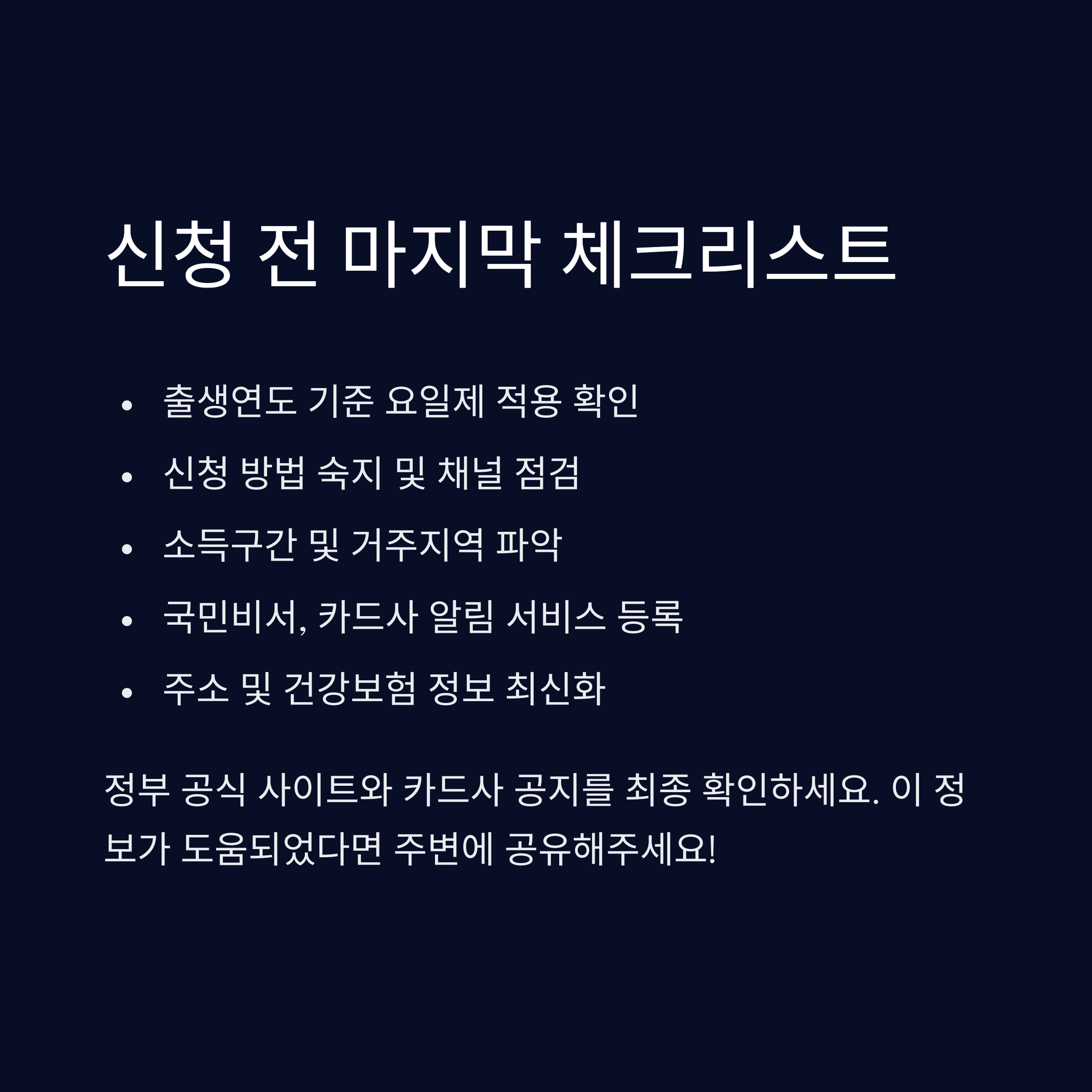 지급일정과 신청 방법은 시간이 지나면서 변경될 수 있으므로, 정부 공식 사이트와 카드사 공지를 반드시 최종 확인하시기 바랍니다. 실수로 신청을 놓치면 혜택을 받을 수 없으니 지금 바로 신청 준비를 시작하세요.