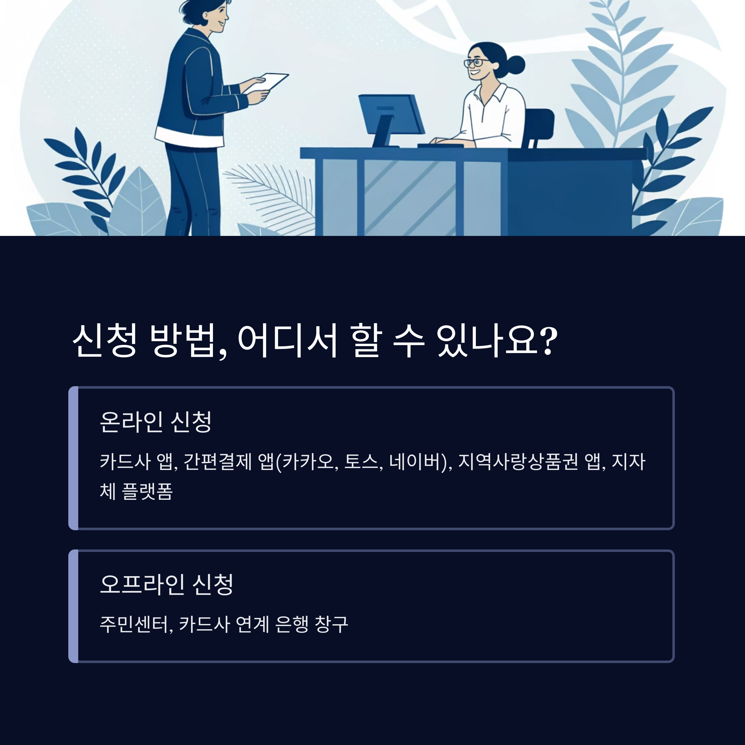 온라인 신청은 주요 카드사(국민, 신한, 농협 등), 간편결제 앱(카카오, 토스, 네이버 등), 지역사랑상품권 앱, 지자체 플랫폼에서 가능합니다. 오프라인은 카드사 연계 은행 창구, 주민센터에서 접수할 수 있습니다.