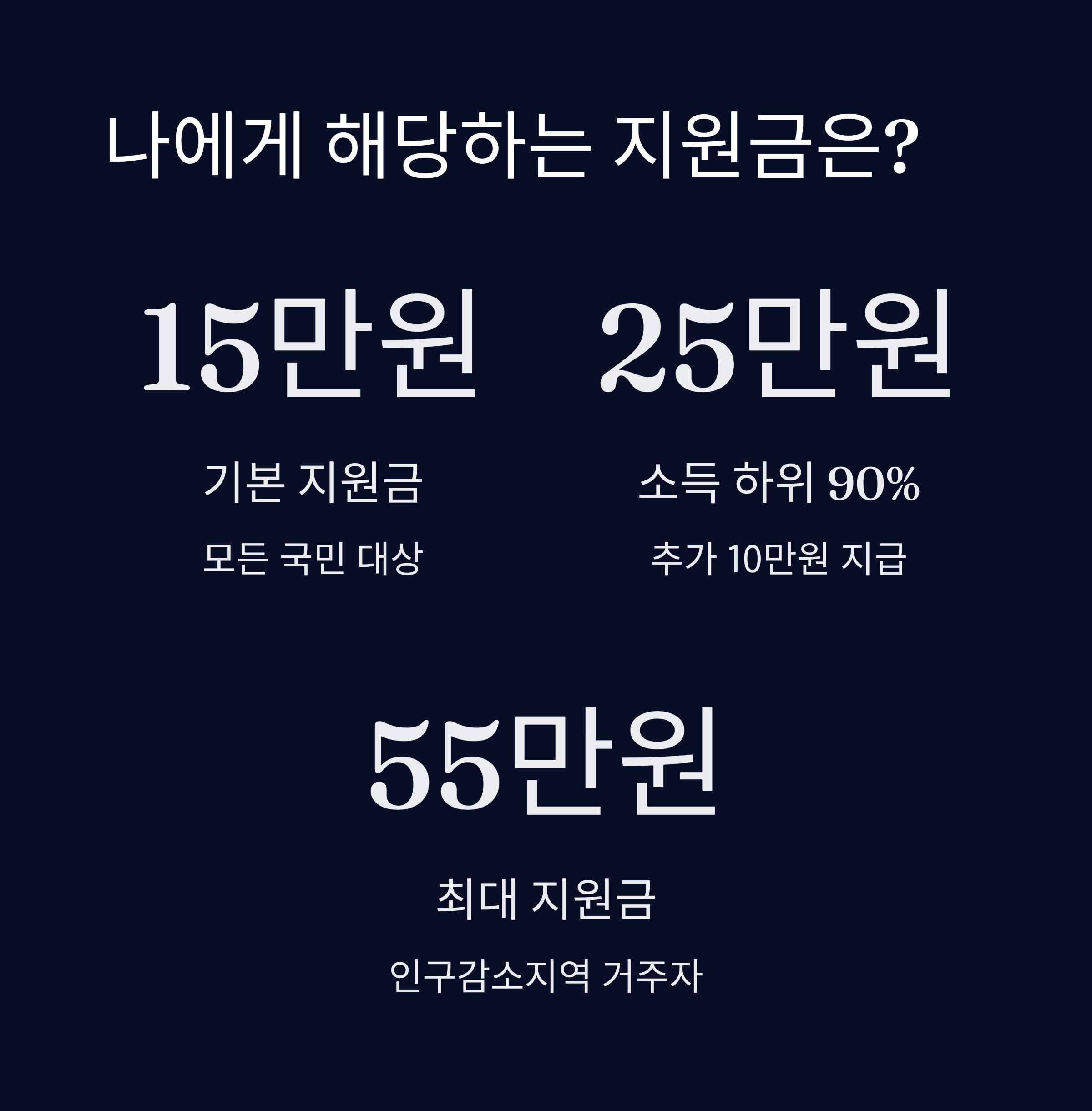 모든 국민에게 15만 원 이상 지급되며, 소득 하위 90%에게는 추가로 10만 원이 주어집니다. 사회적 배려계층은 최대 40만 원, 농어촌 인구감소지역 등 거주자는 가산금까지 포함해 최대 55만 원을 받을 수 있습니다.