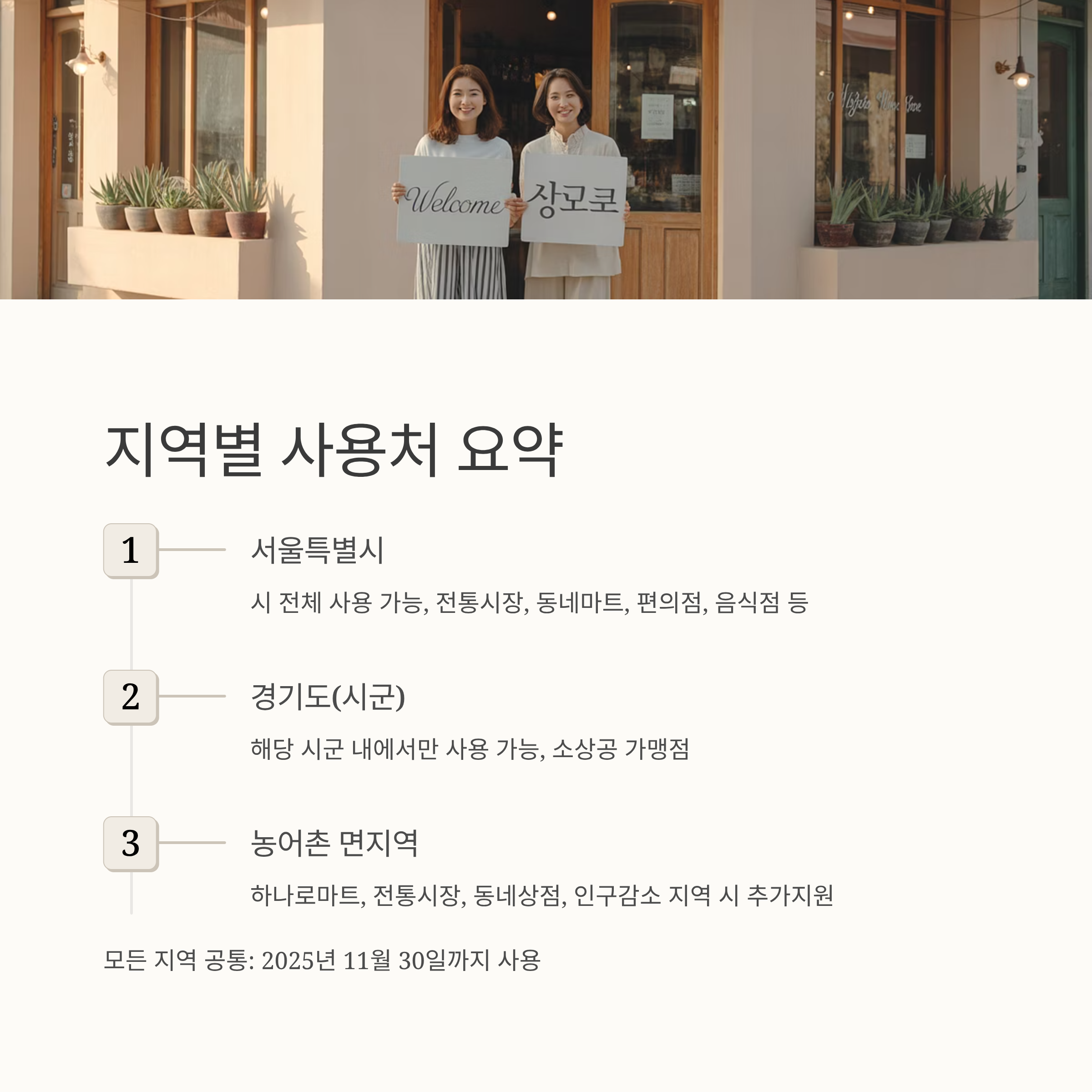 | 서울특별시 | 전통시장, 동네마트, 편의점, 음식점, 미용실, 약국 | 백화점, 면세점, 대형마트, 온라인몰, 유흥, 환금 업종 | 2025년 11월 30일까지 | 시 전체 사용 가능, 스티커 부착 필수 |