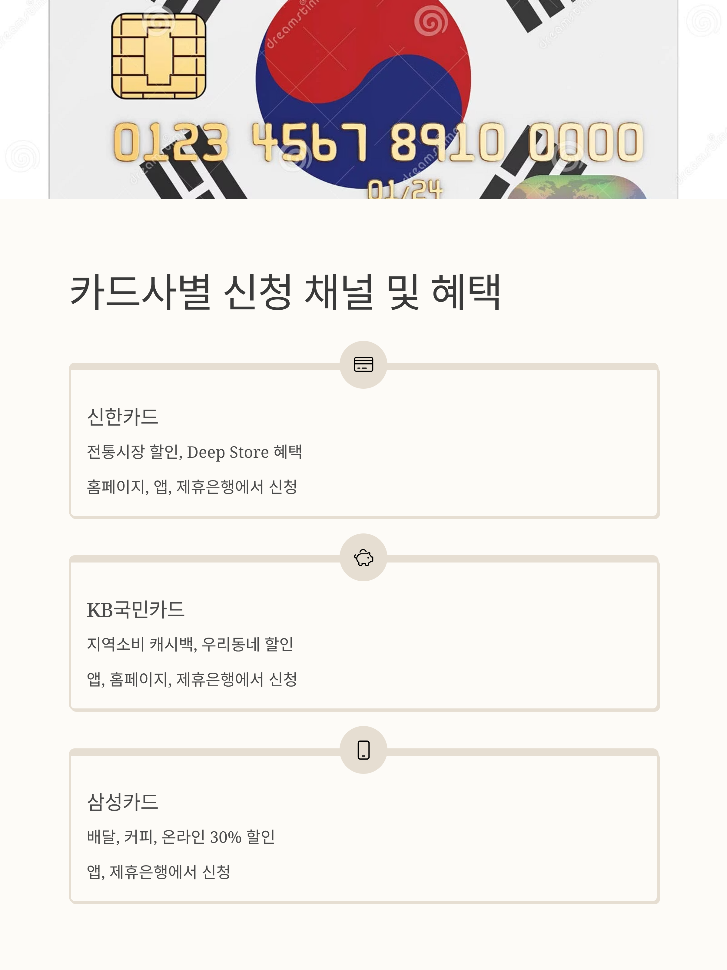 | 신한카드 | 홈페이지, 앱, 제휴은행 | 전통시장 할인, Deep Store 등 | O |