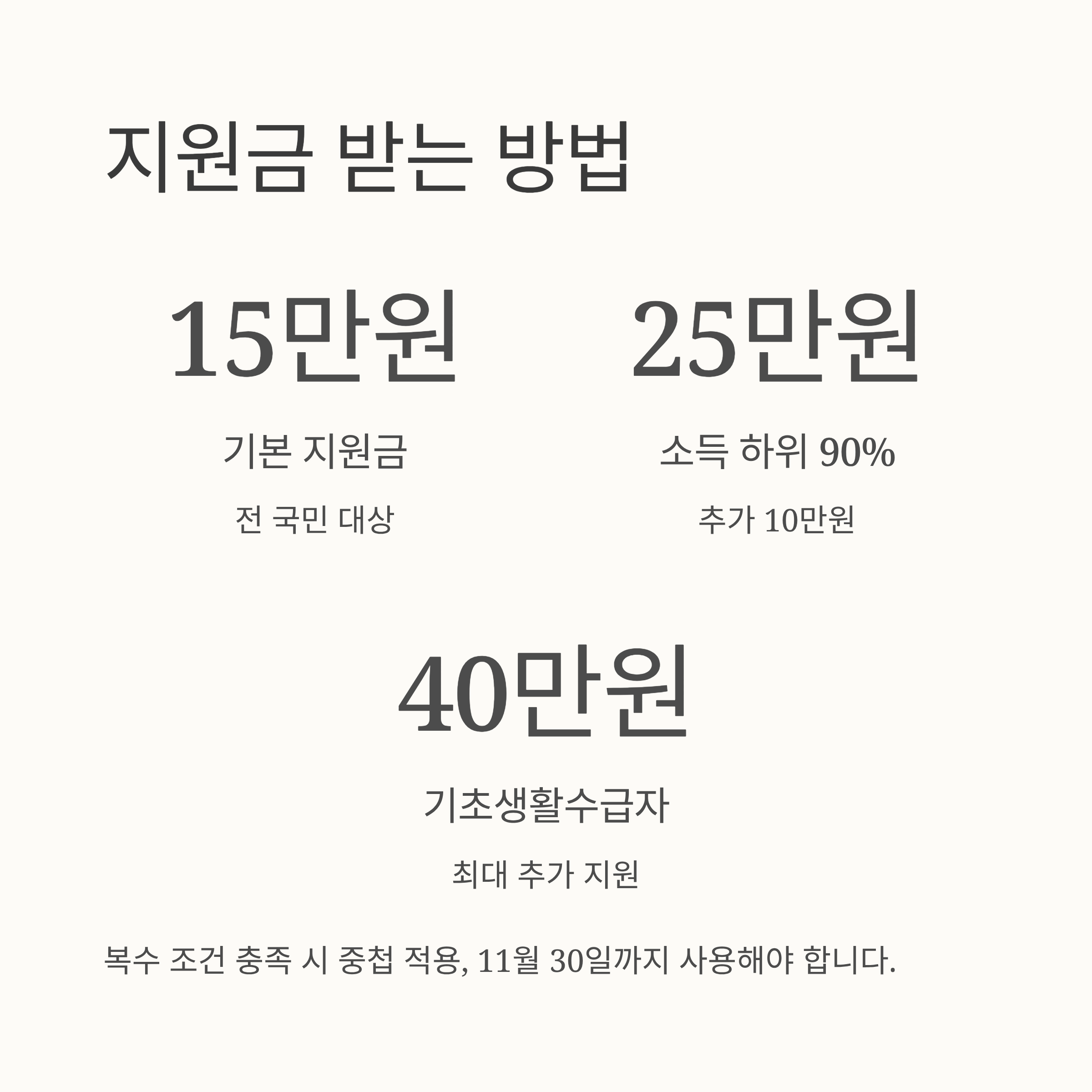 지급 구조는 다음과 같습니다. 전 국민이 받는 1차 15만원에 다양한 추가 조건이 더해져