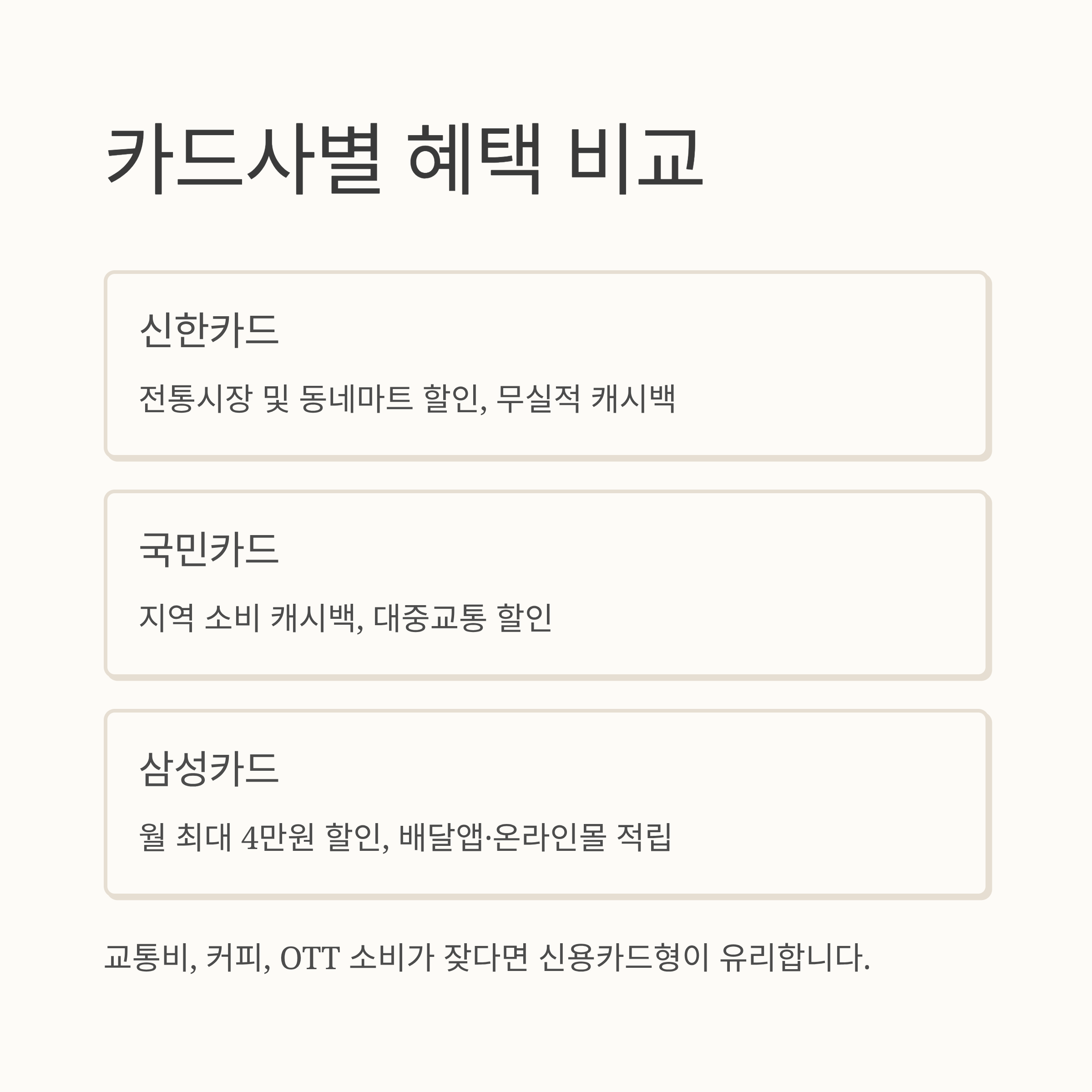특히 교통비와 커피, OTT 소비가 잦다면 신용카드형이 실질 혜택 면에서 유리합니다.