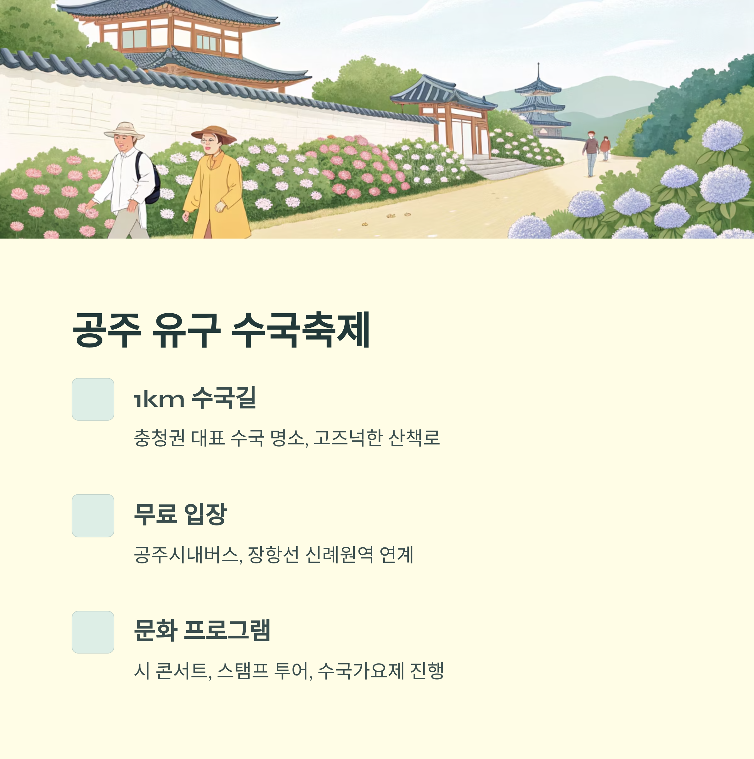 공주 유구 수국축제, 고즈넉한 산책로 따라 흐르는 수국의 향기