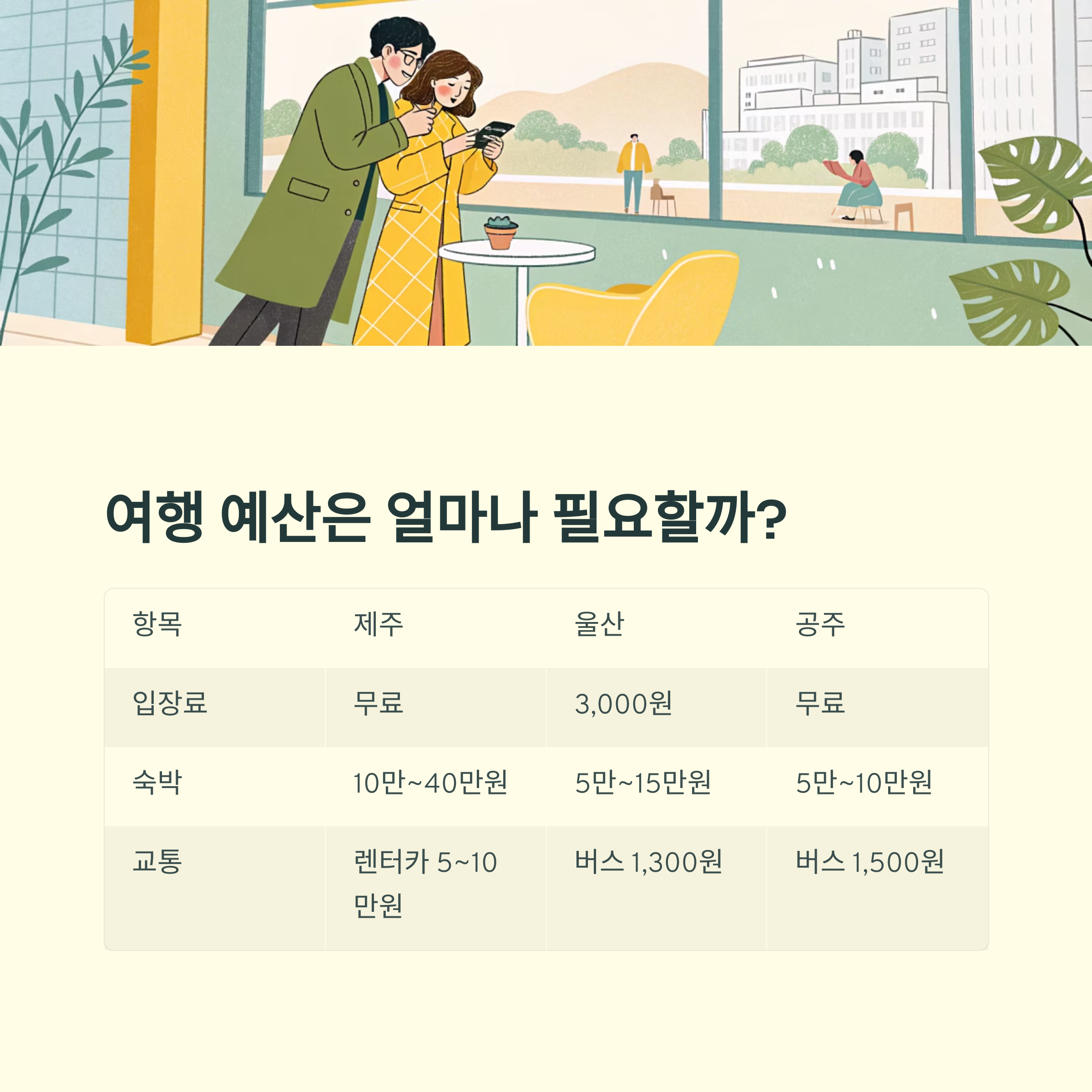 | 숙박 | 10만~40만 원 | 5만~15만 원 | 5만~10만 원 |