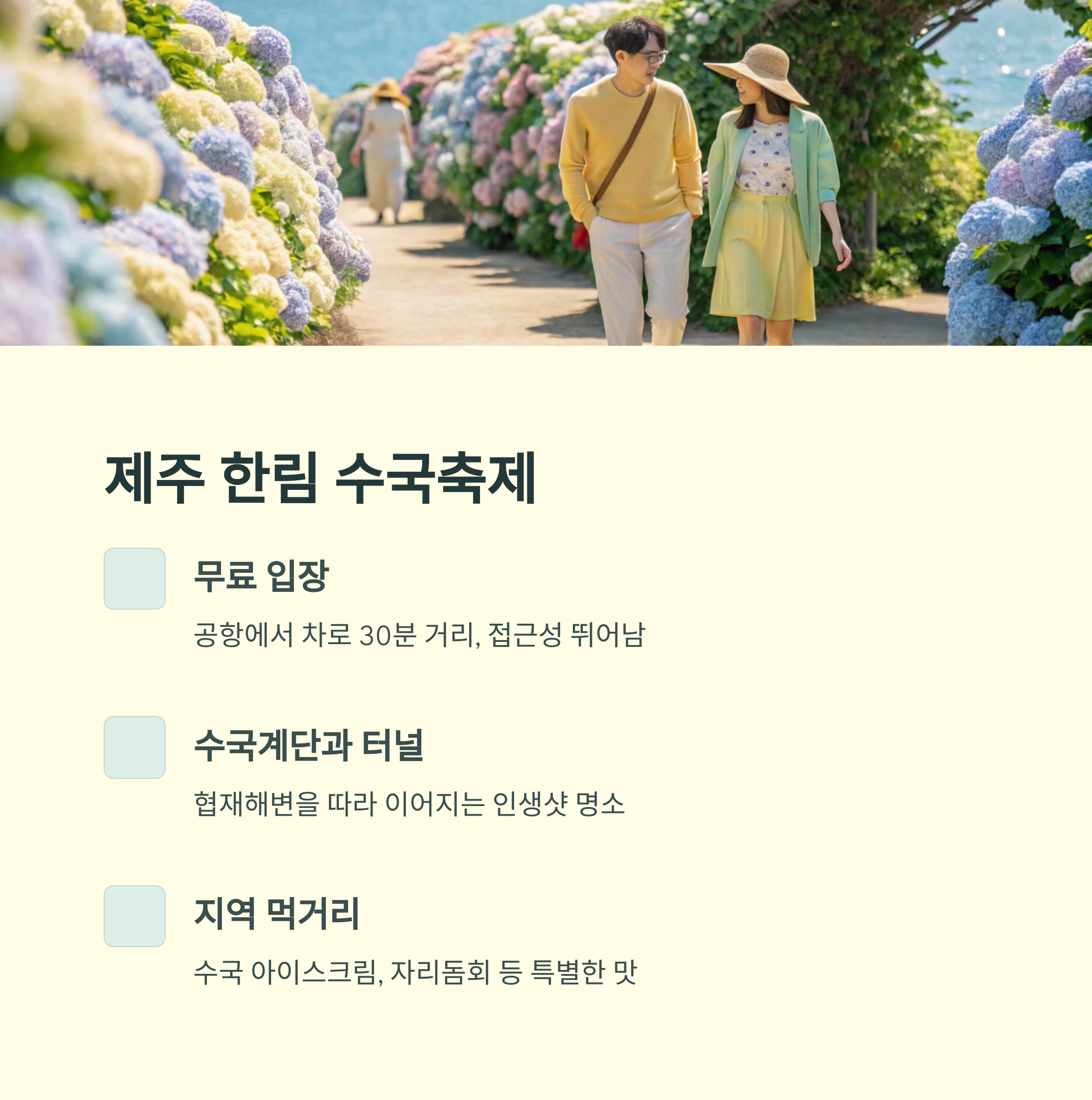 수국과 바다가 어우러진 한림 수국축제는 제주에서도 손꼽히는 여름 명소입니다.
