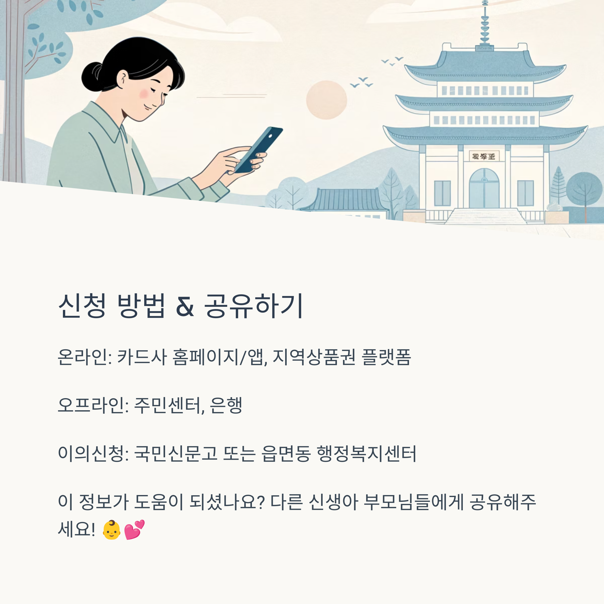 - 온라인 신청: 카드사 홈페이지, 앱, 지역상품권 플랫폼