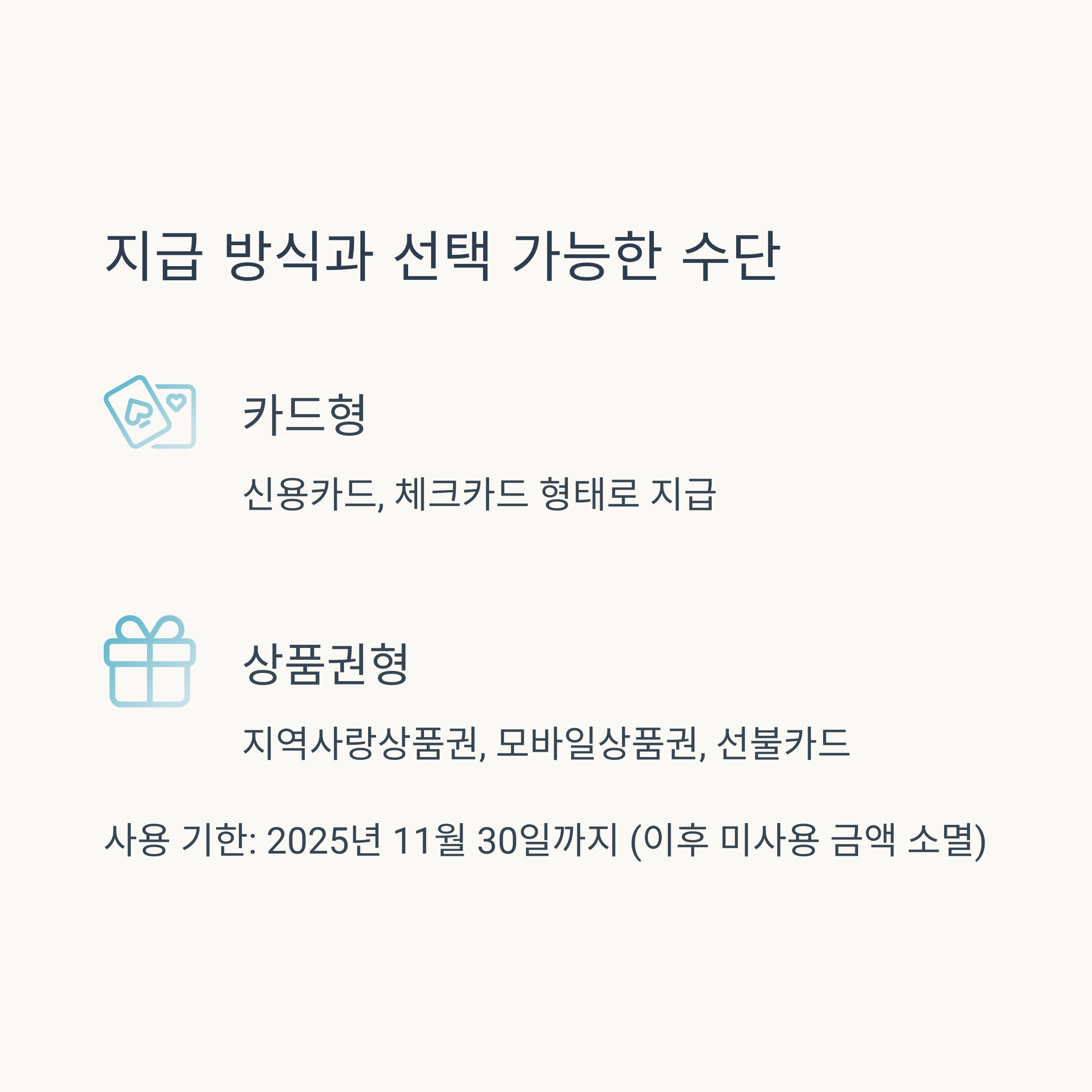 지역사랑상품권 또는 카드 형태로 받을 수 있습니다.