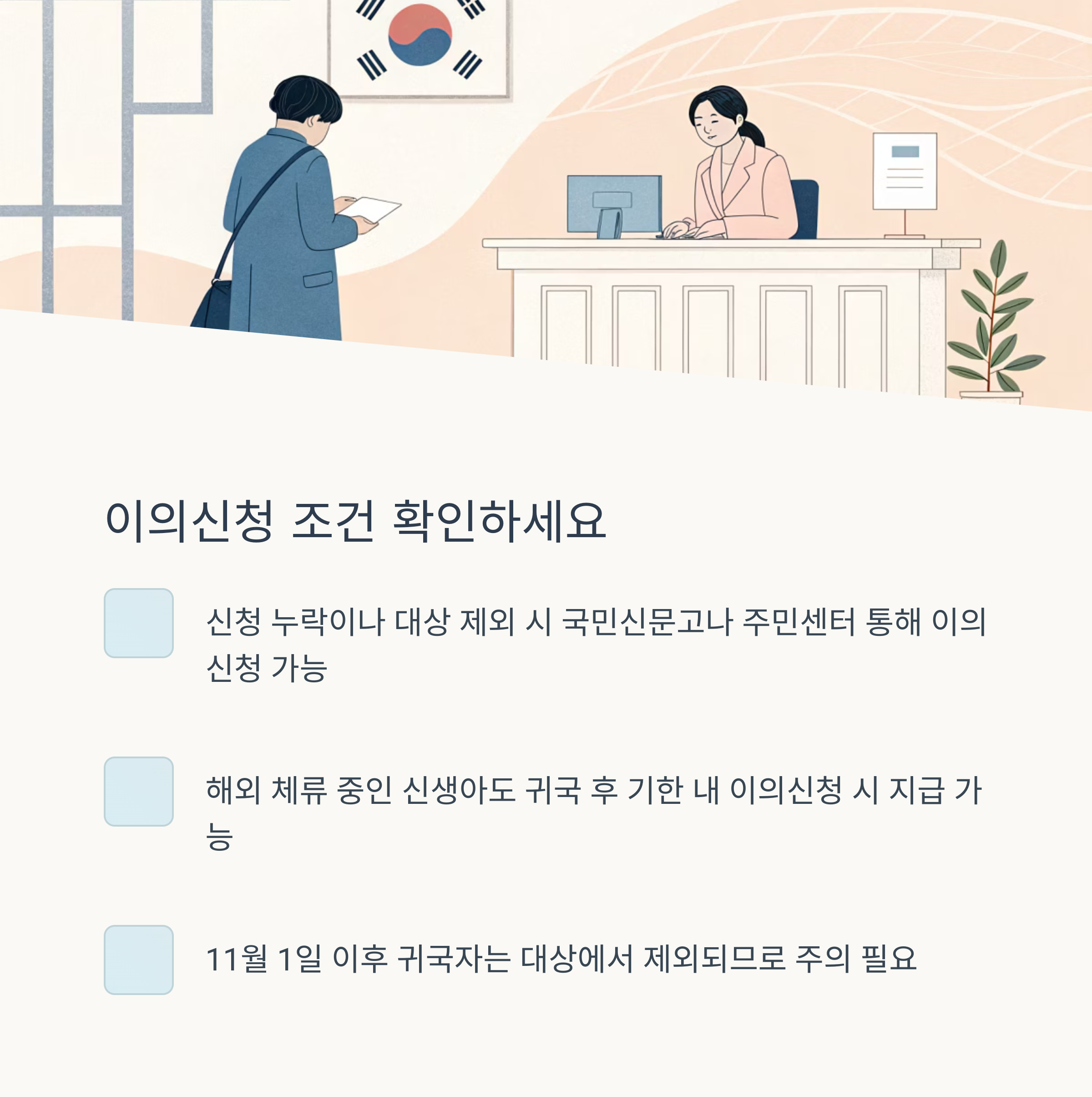 해외 체류 중인 신생아도 귀국 후 기한 내 이의신청 시 지급 가능하며,