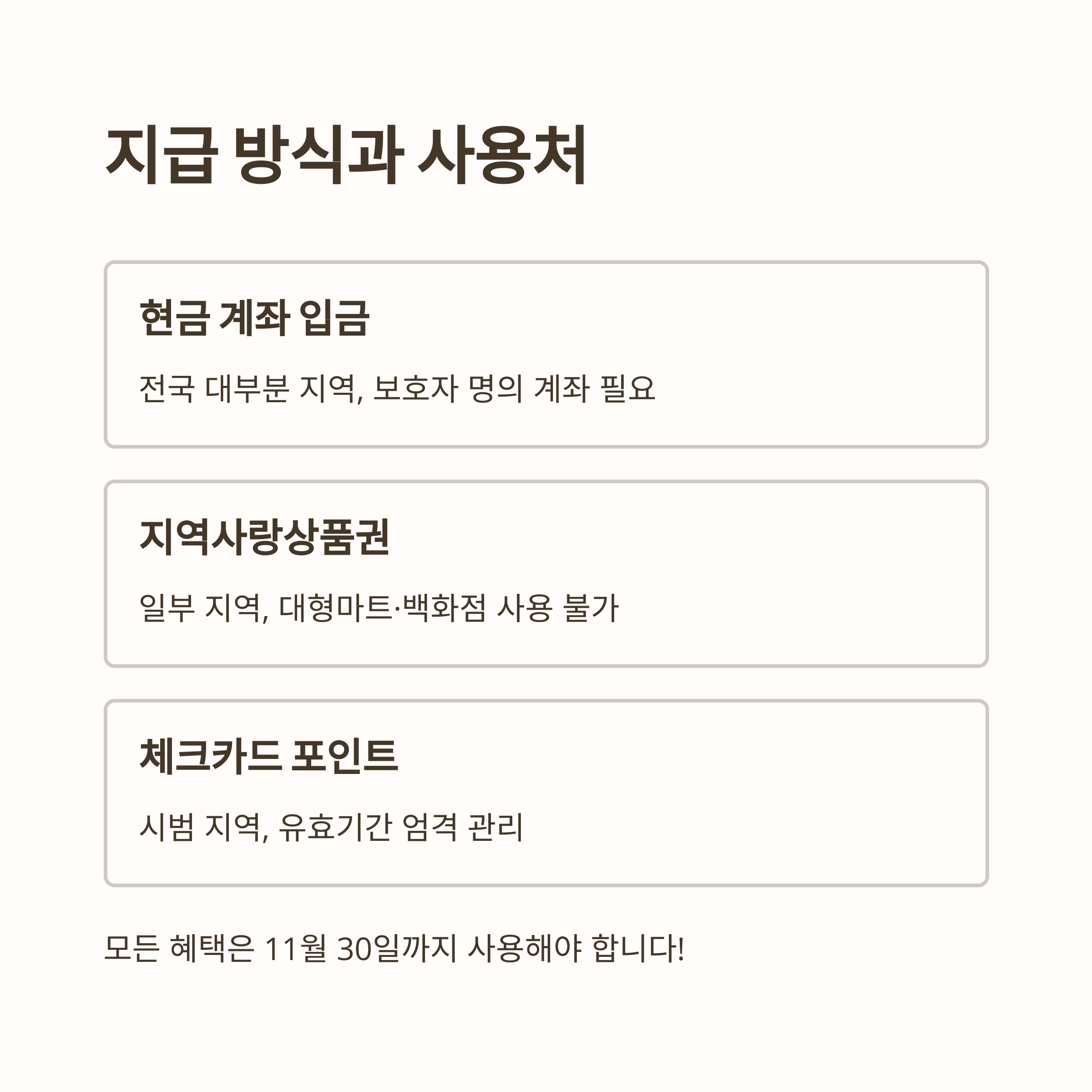 | 현금 계좌 입금 | 전국 대부분 | 보호자 명의 계좌 필요 |