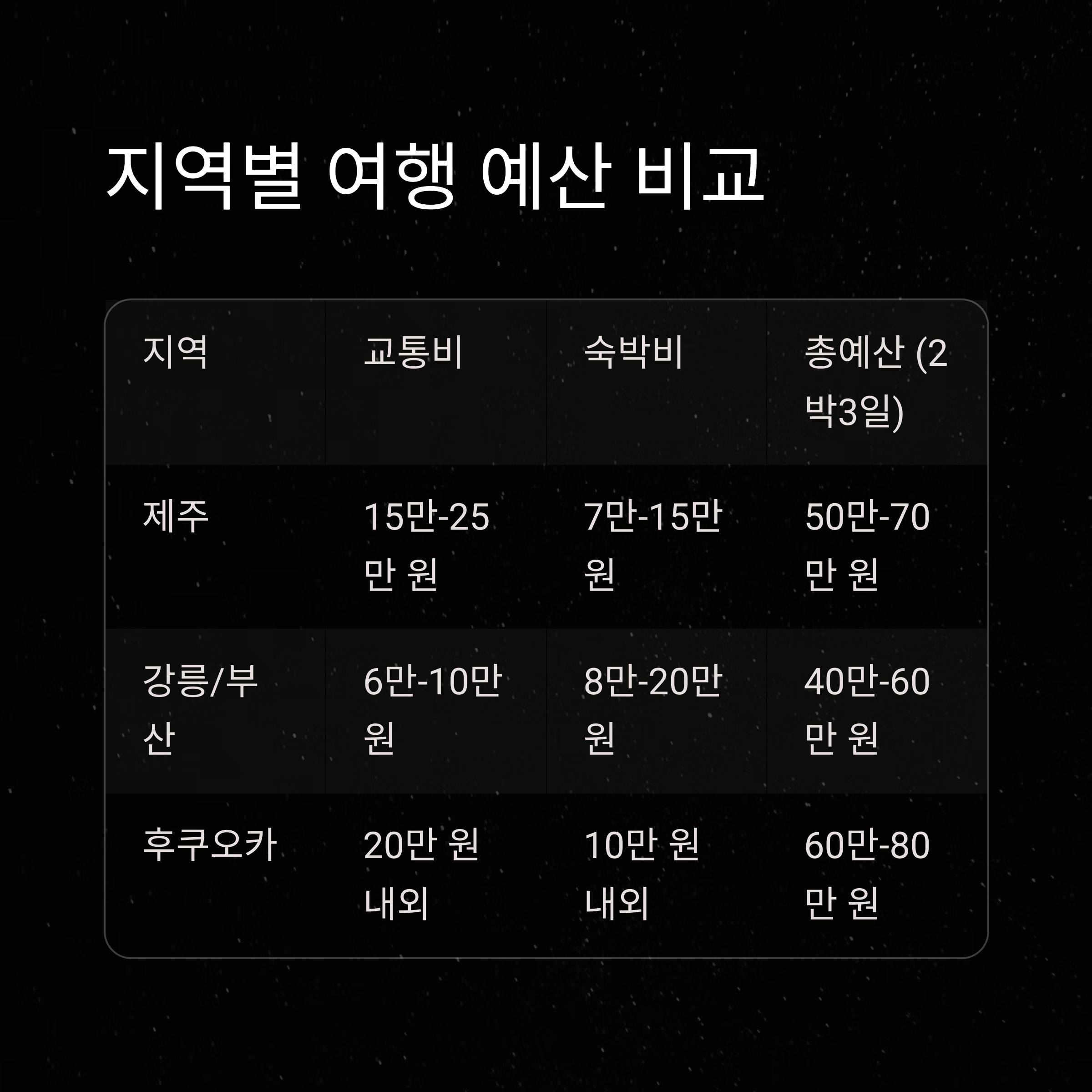 지역 교통비 숙박비 총예산 (2박 3일, 1인)