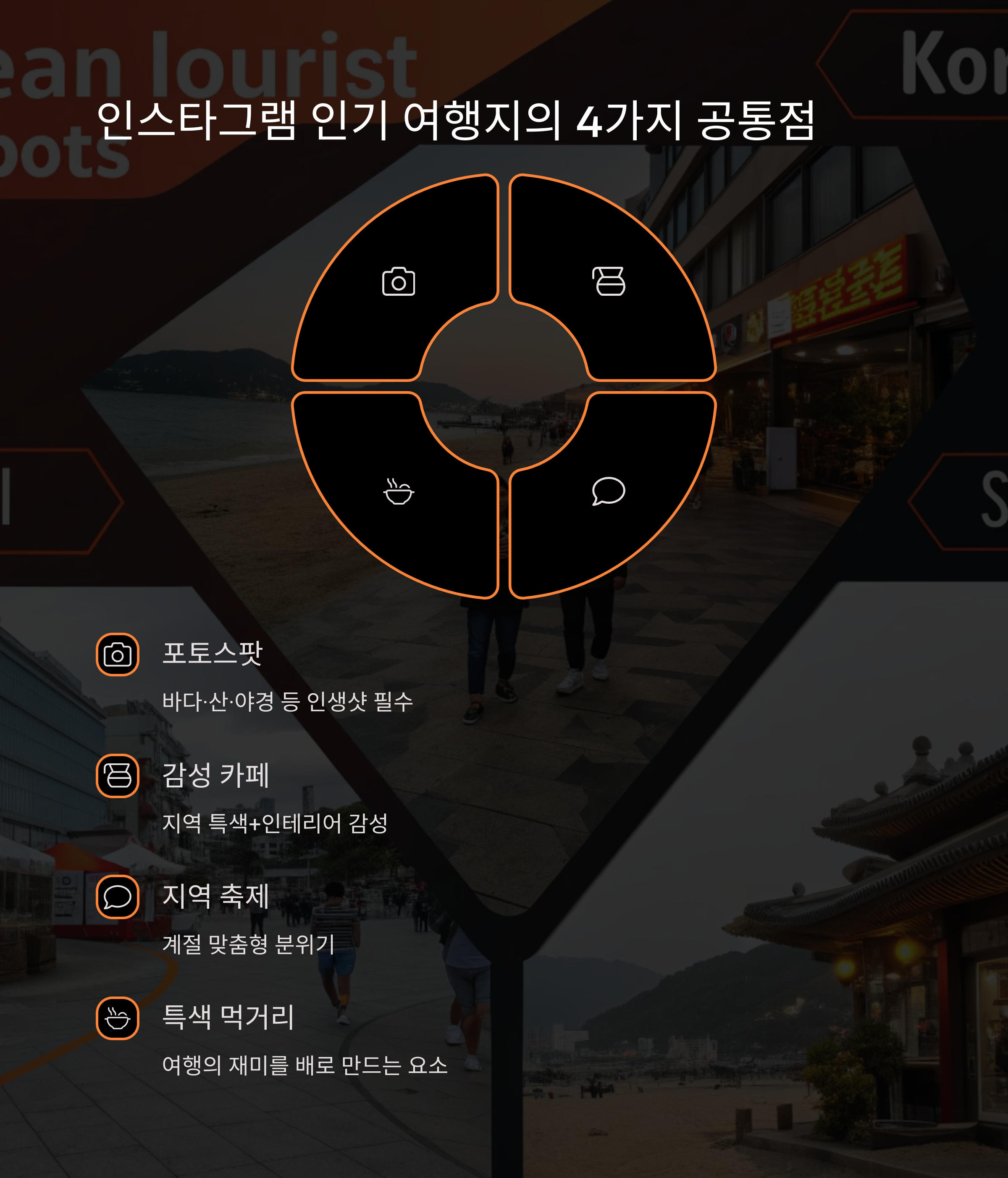 인스타그램 인기 여행지의 키워드는 다음 네 가지로 요약됩니다.