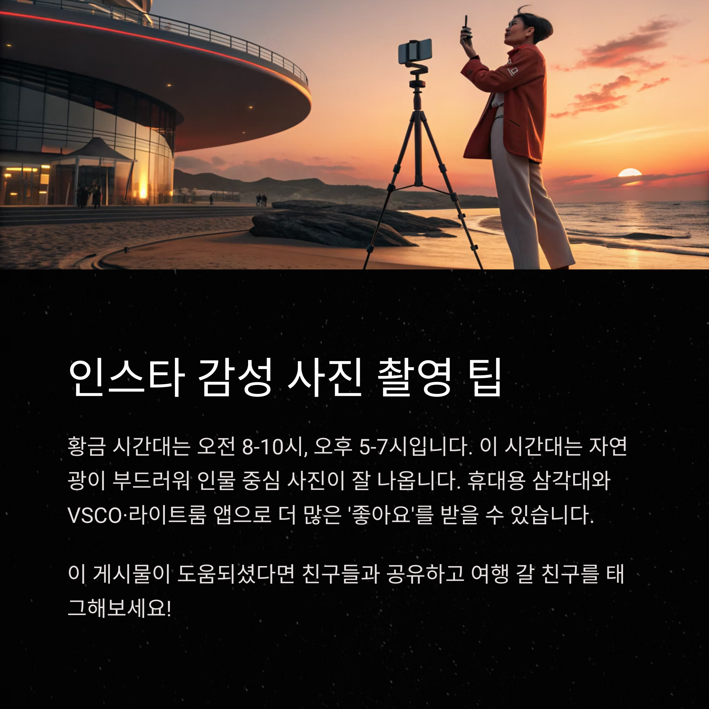 휴대용 삼각대, VSCO·라이트룸 같은 보정 앱을 활용하면 더 많은 ‘좋아요’를 받을 수 있는 퀄리티 있는 사진을 남길 수 있습니다.