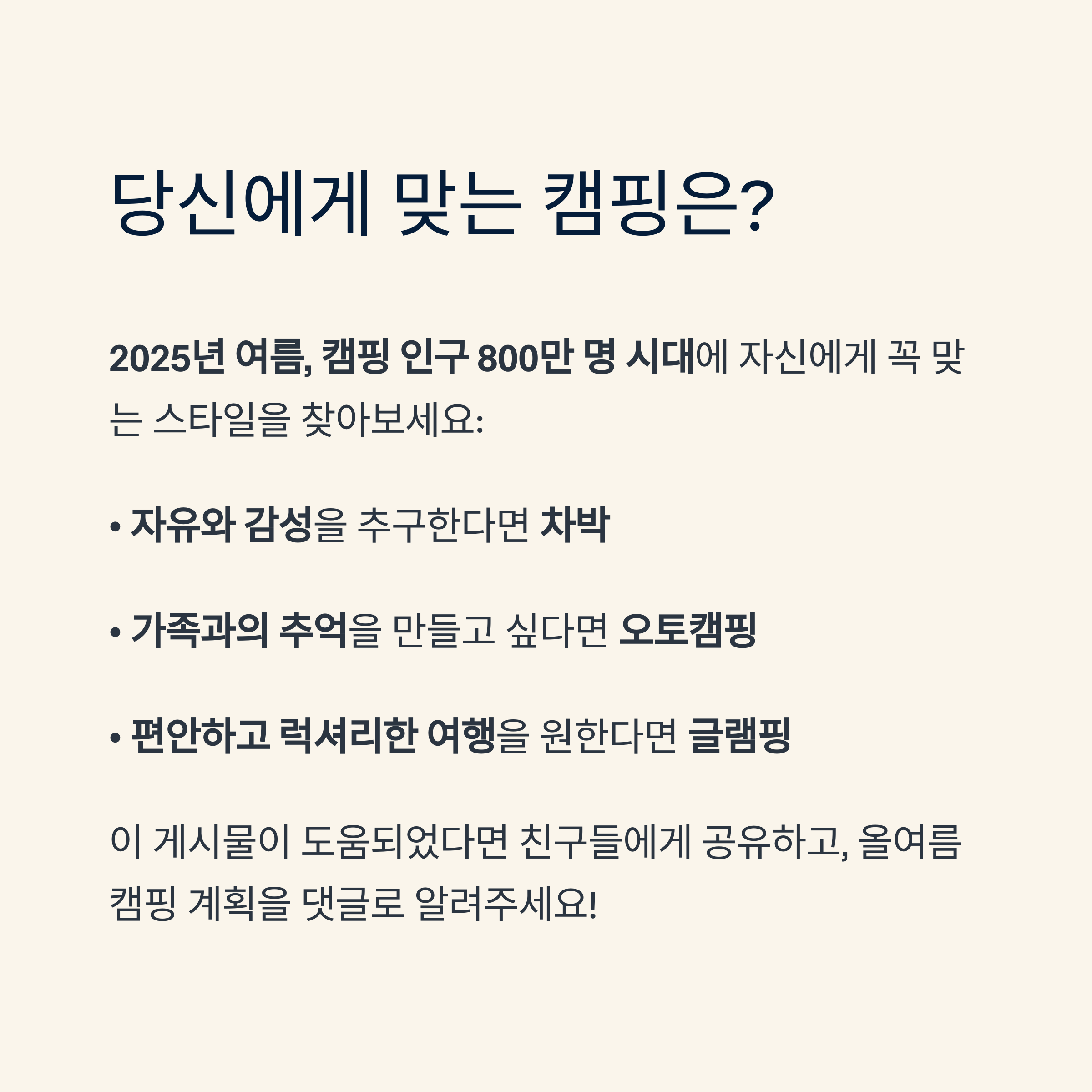 | 글램핑 | 10~40만 원 | 호텔급 편의, 장비 불필요 | 비용 부담, 자유도 제한 | 초보자, 가족, 연인 |