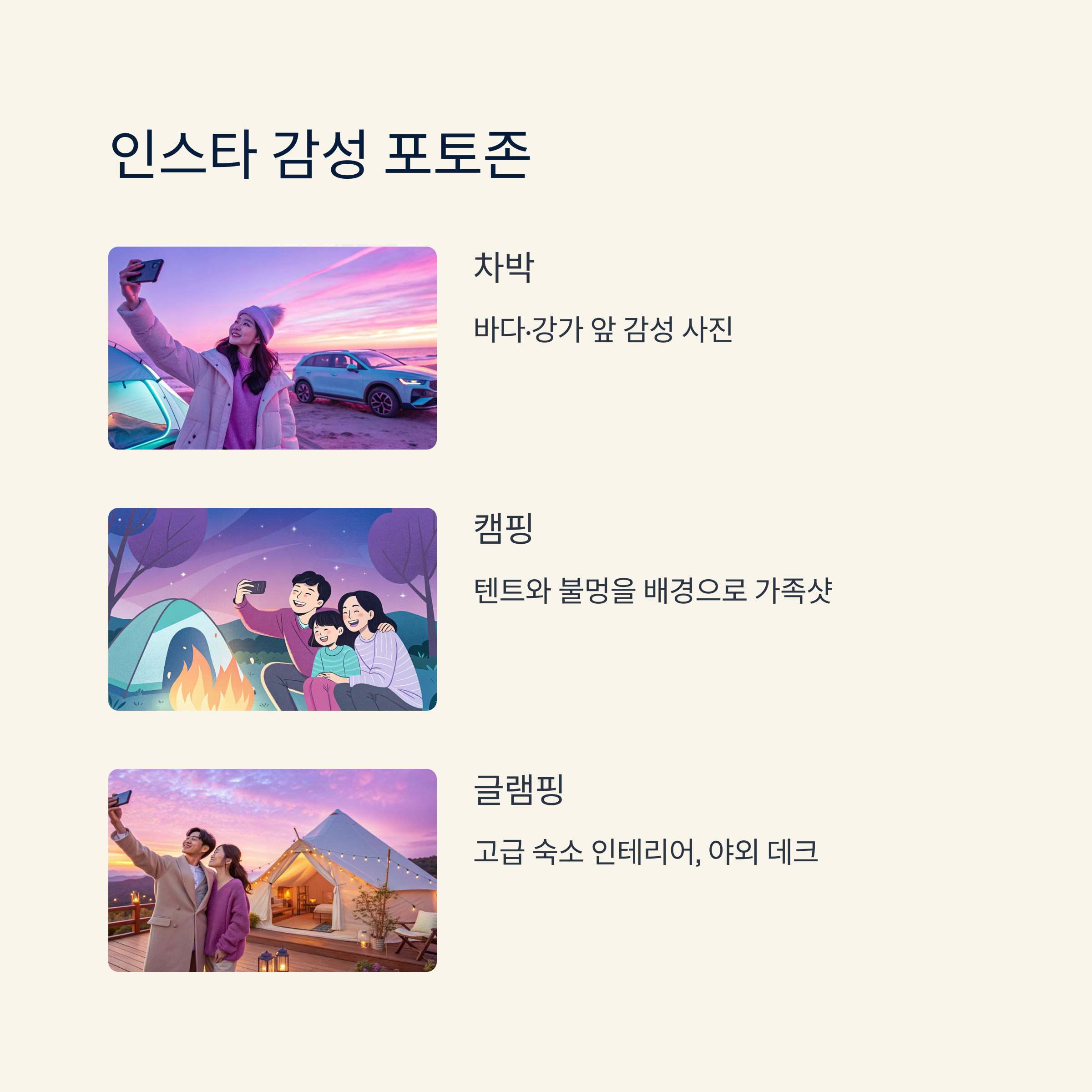 | 차박 | 감성 캠핑, 비용 절감, 자유도 최고 |