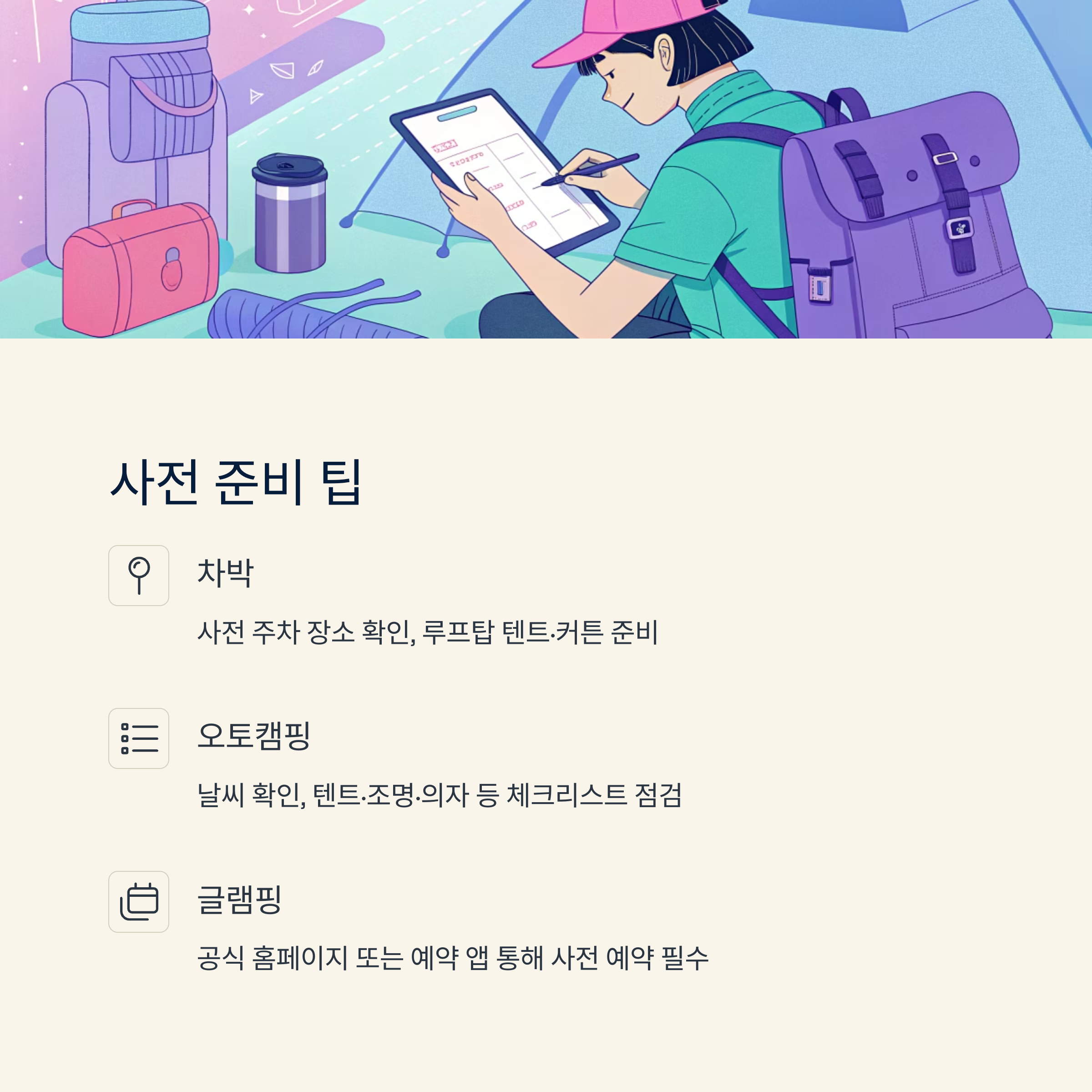 - 차박: 사전 주차 장소 확인, 장비는 루프탑 텐트·커튼 등
