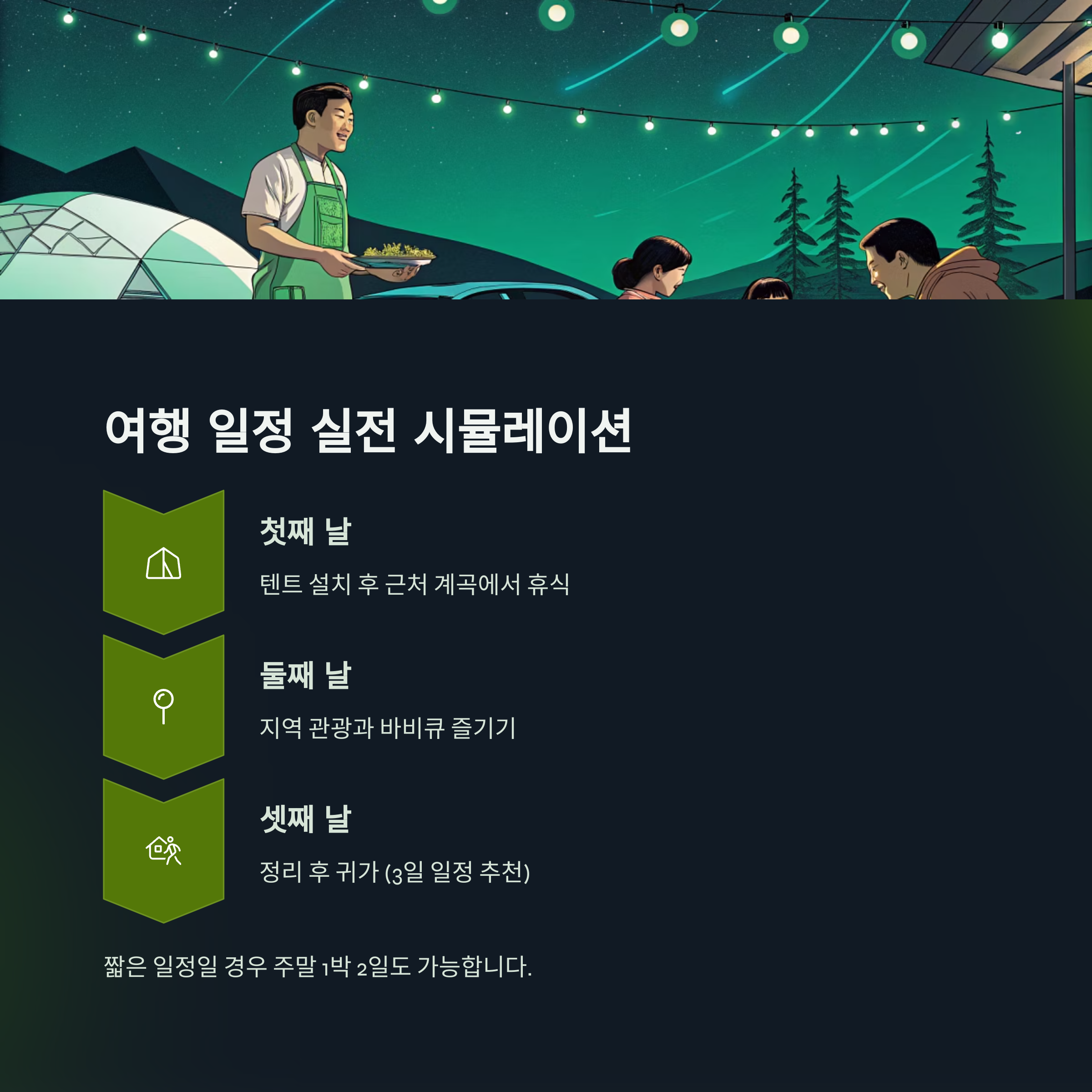 둘째 날 지역 관광과 바비큐, 셋째 날 정리 후 귀가하는