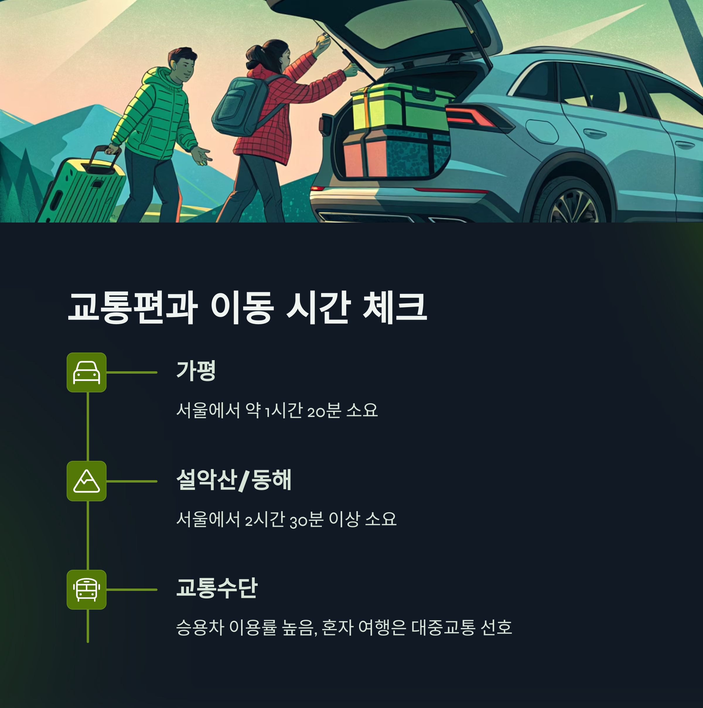 가평은 약 1시간 20분, 설악산과 동해는 2시간 30분 이상 소요됩니다.