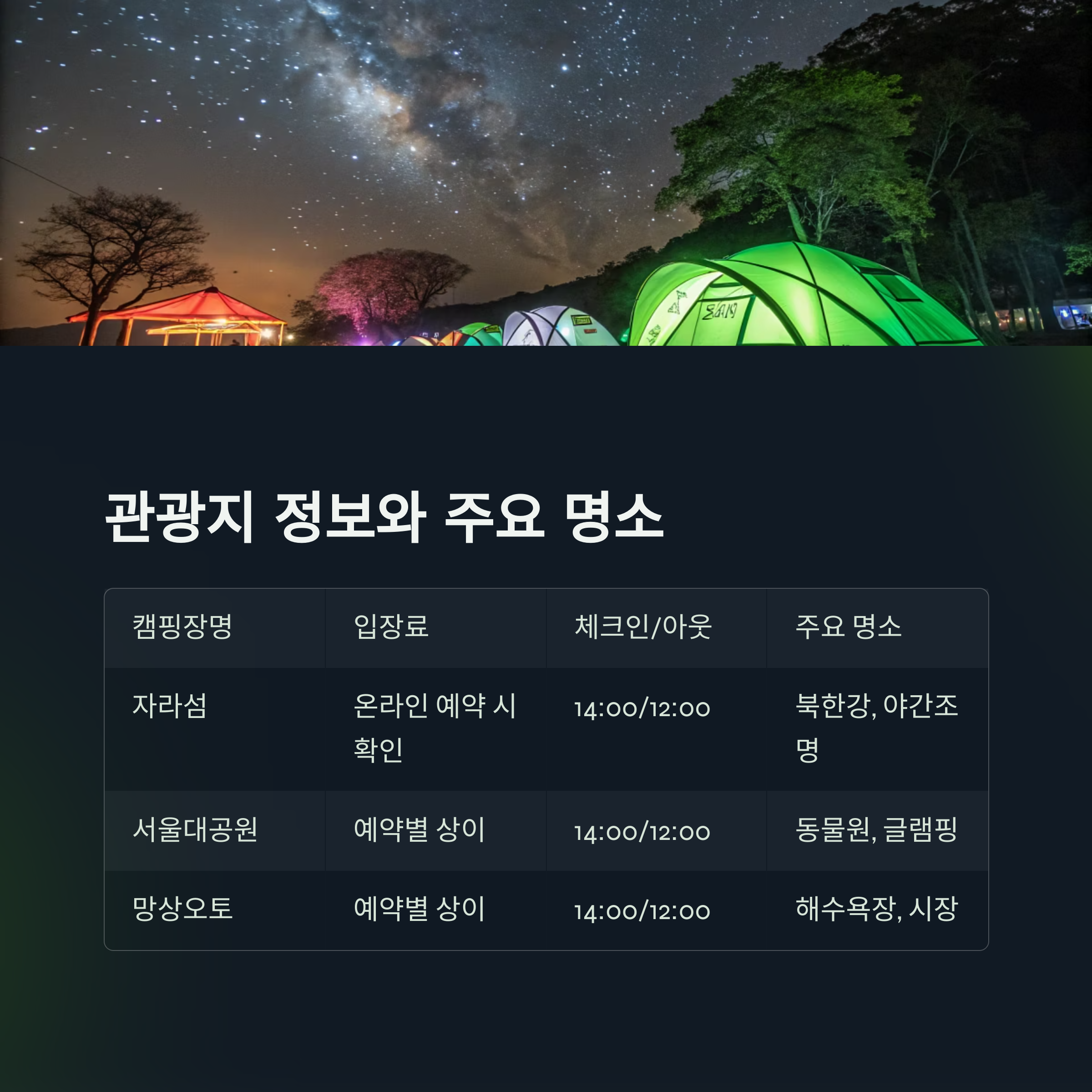 캠핑장명 입장료 체크인/아웃 주요 명소