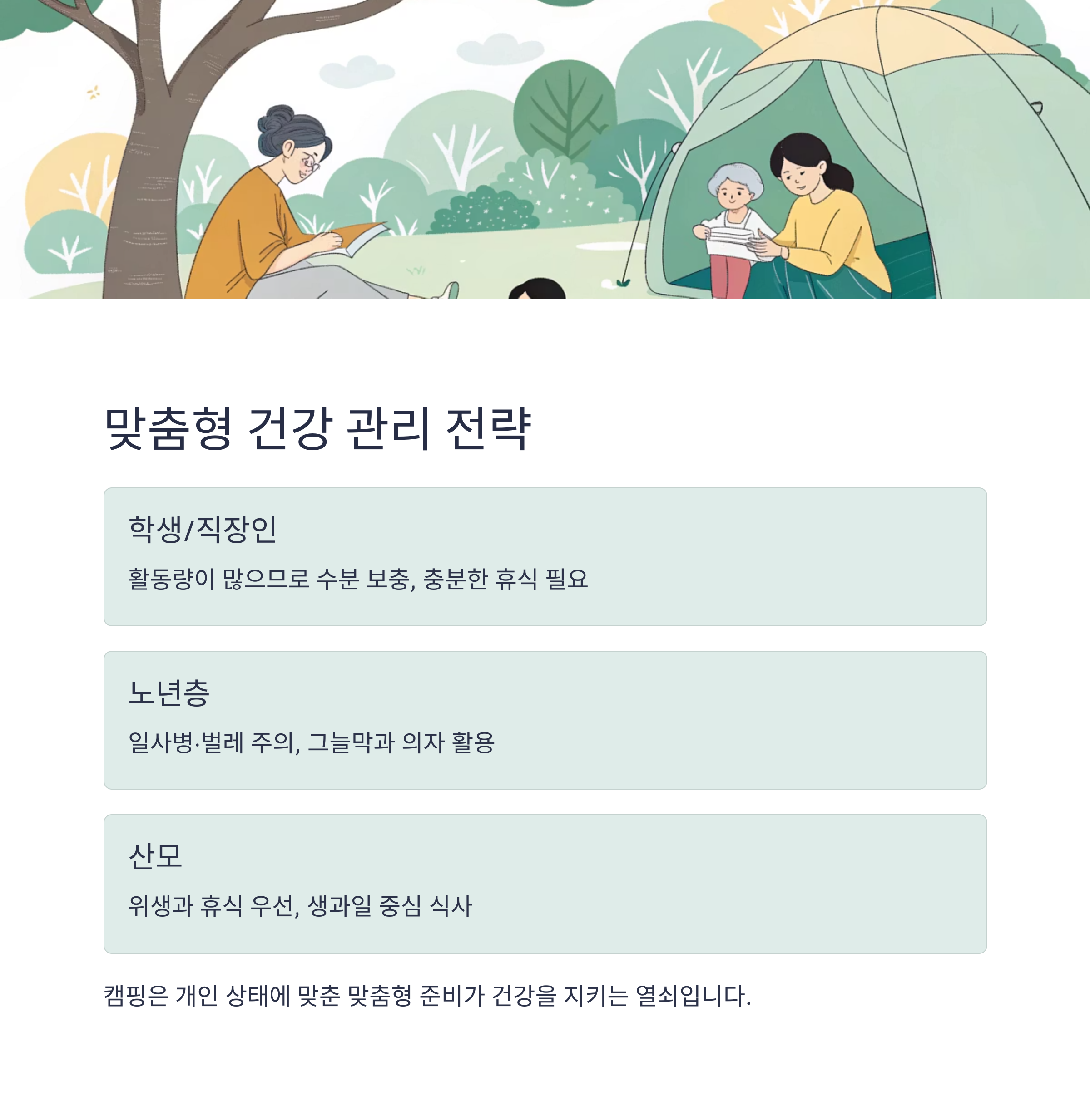 핵심: 캠핑은 개인 상태에 맞춘 맞춤형 준비가 건강을 지키는 열쇠입니다.
