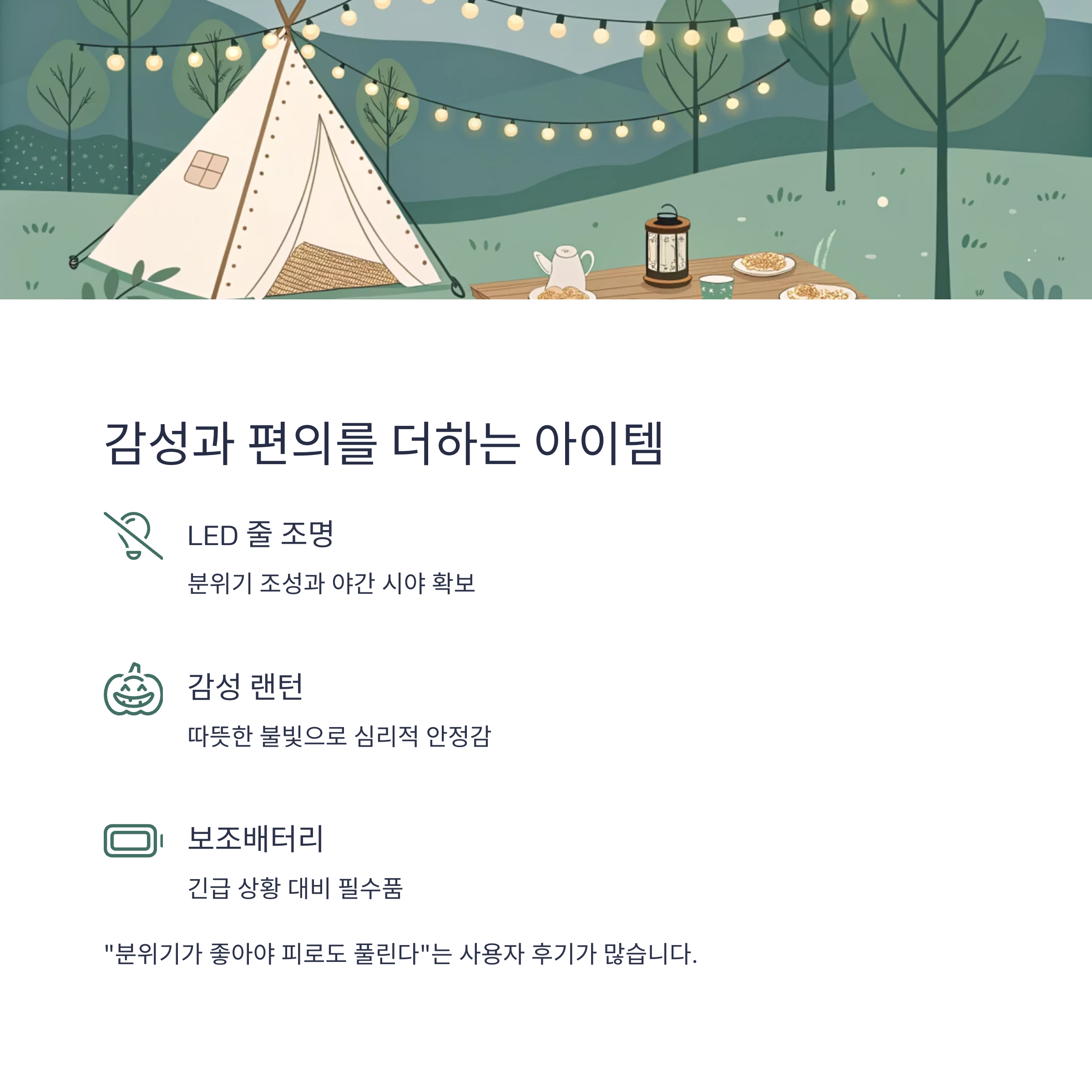 LED 줄 조명, 감성 랜턴, 우드 식기, 보조배터리 등은 캠핑의 즐거움을 더해줍니다.