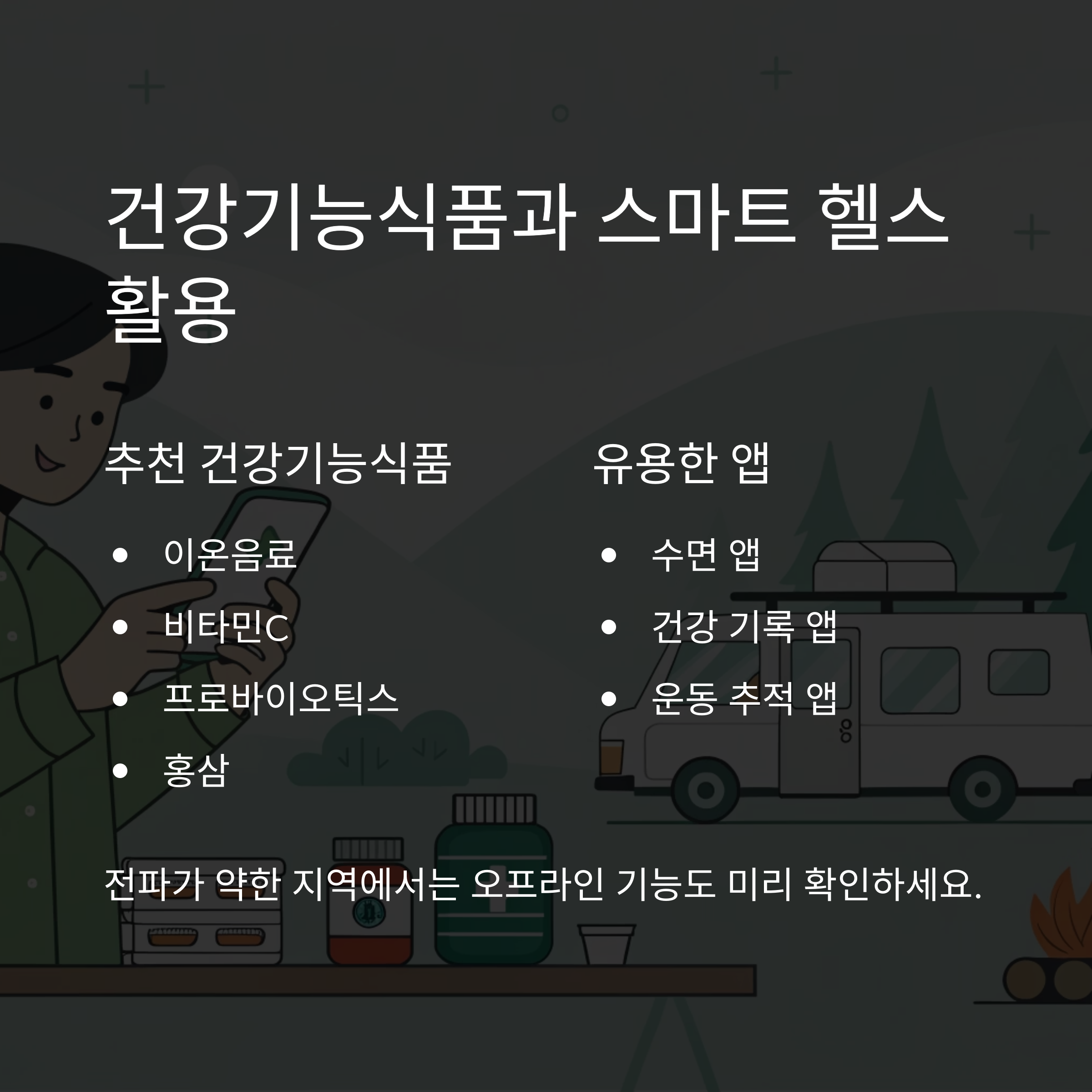 이온음료, 비타민C, 프로바이오틱스, 홍삼은 캠핑 중 면역력과 에너지 보충에 좋습니다.