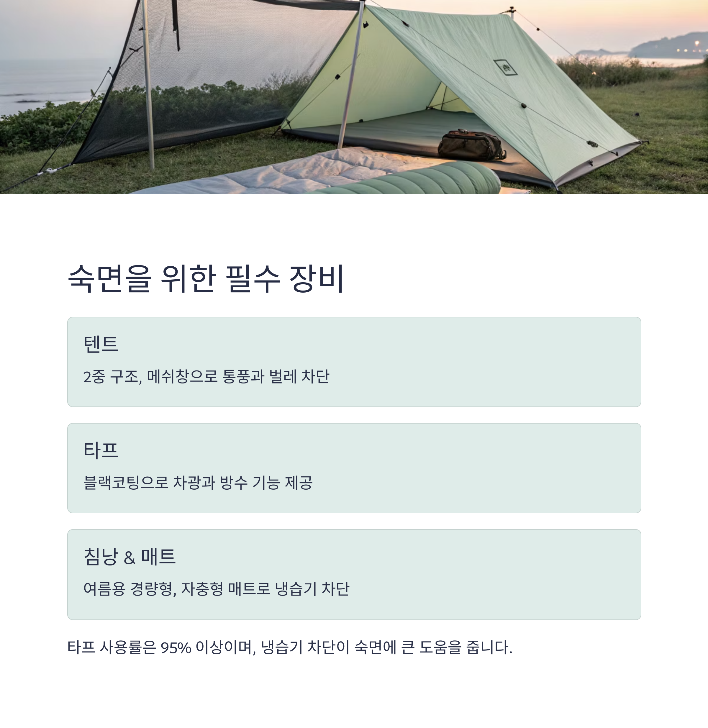 핵심: 타프 사용률은 95% 이상이며, 냉습기 차단이 숙면에 큰 도움을 줍니다.