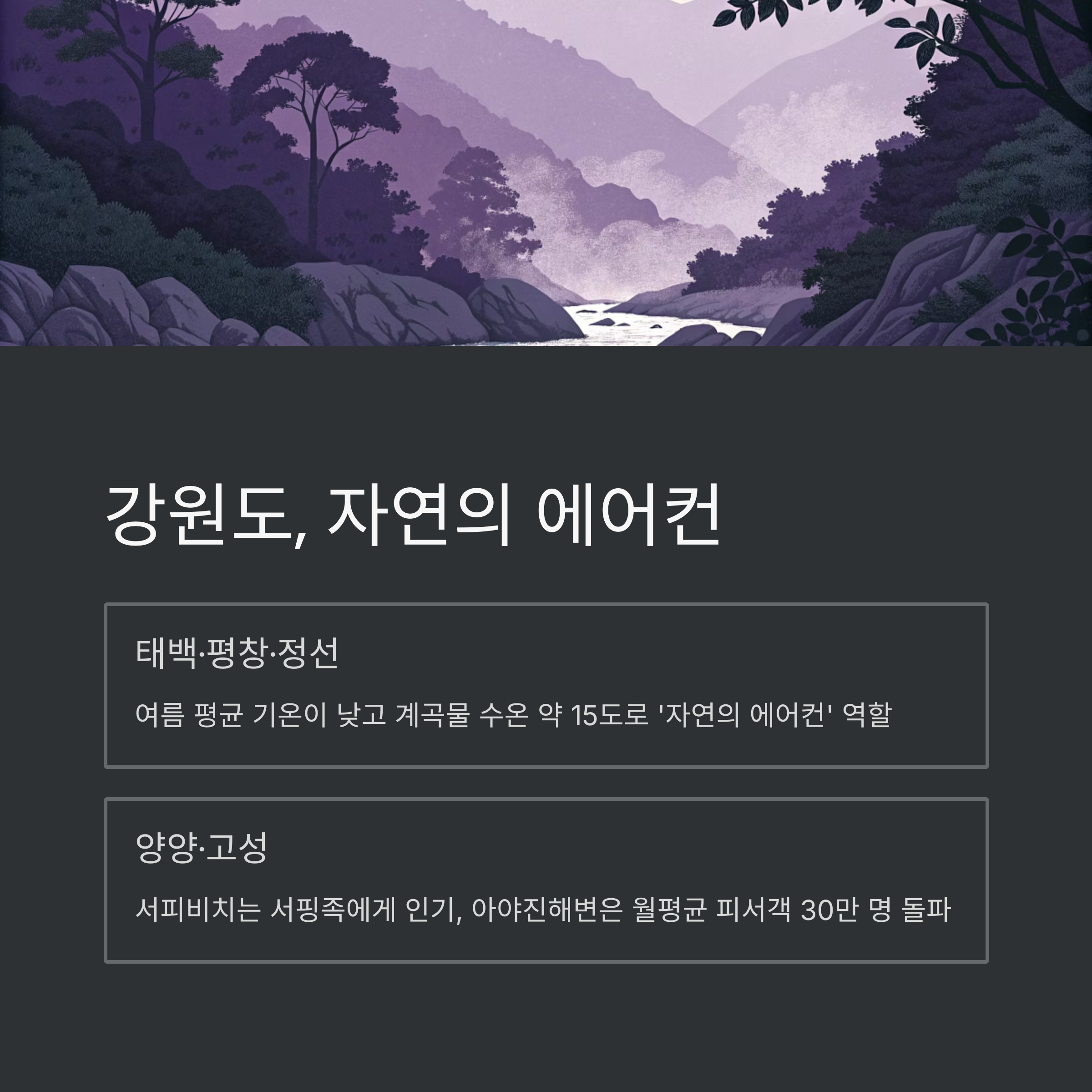 | 강원도 | 매우 높음(85%) | 시원한 기후, 냉계곡 다수 |