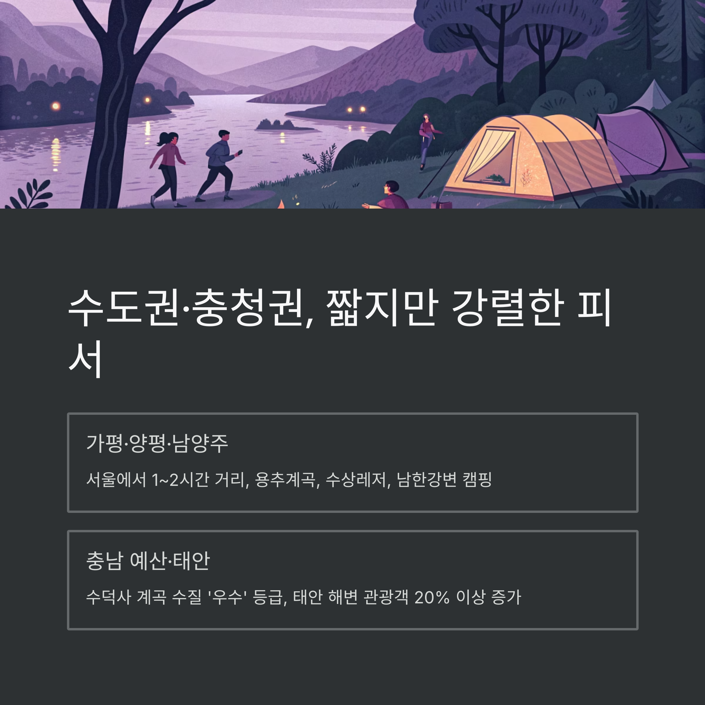 | 충청·내륙 | 높음(78%) | 자연 계곡, 문화 유산 풍부 |