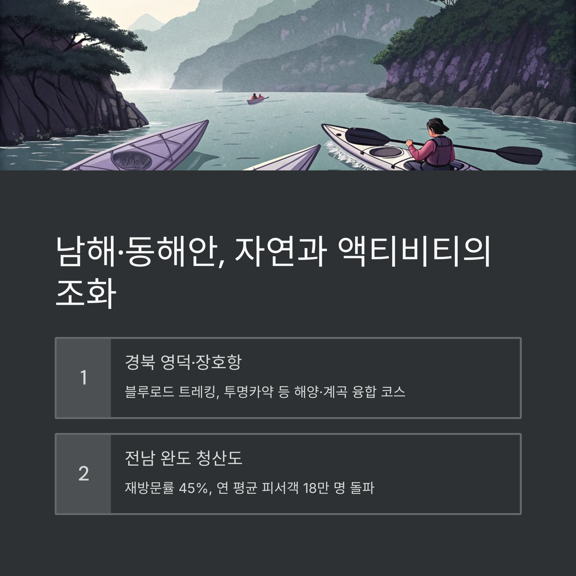 | 남해·동해안 | 높음(80%) | 해양 레저+계곡 융합 |