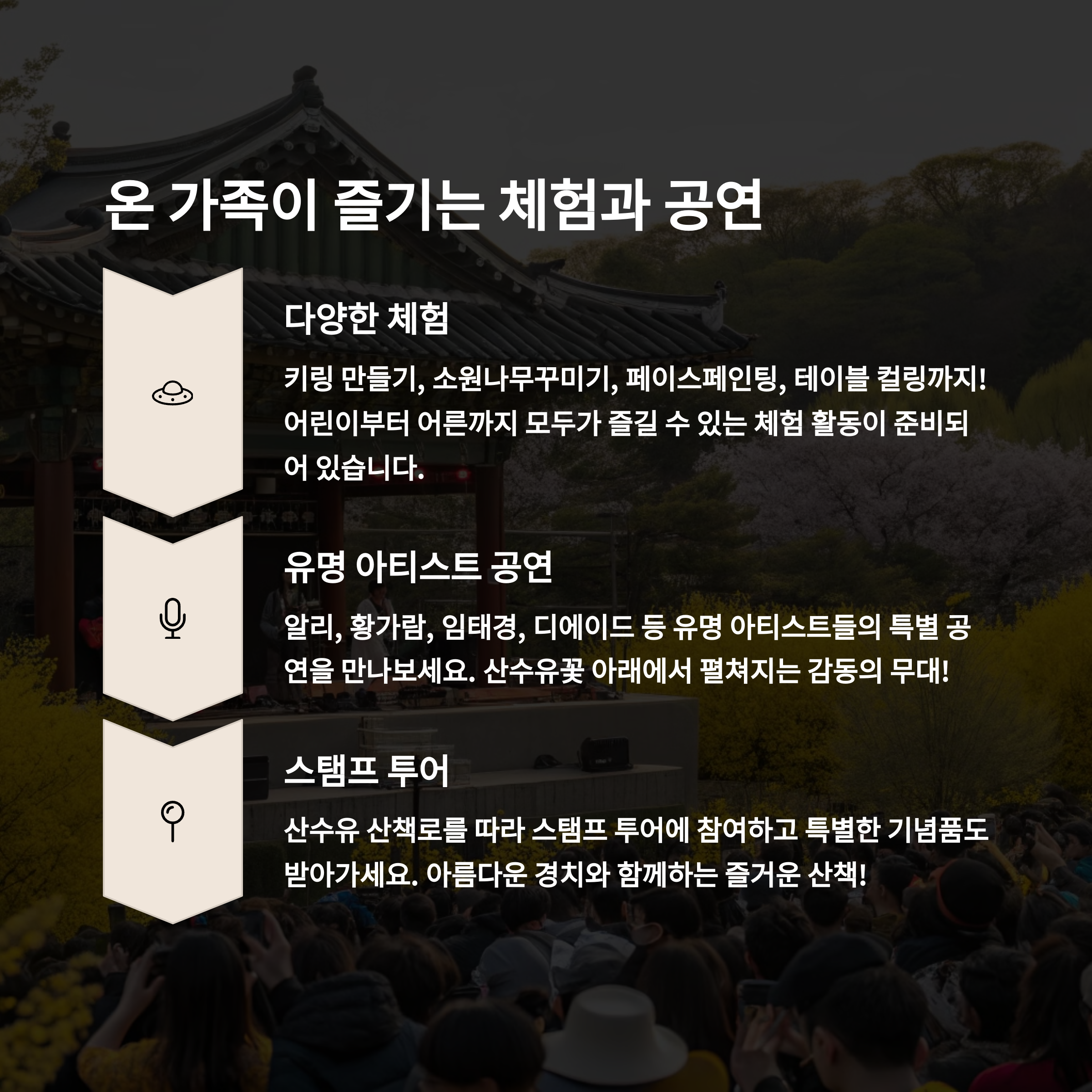 | 산수유꽃이 만개하는 시기에 열리는 의성 대표 봄축제 | 공연, 전시, 체험 등 다양한 즐길거리와 볼거리 가득 | 2025년 3월 22일부터 30일까지 9일간 진행되는 축제 |