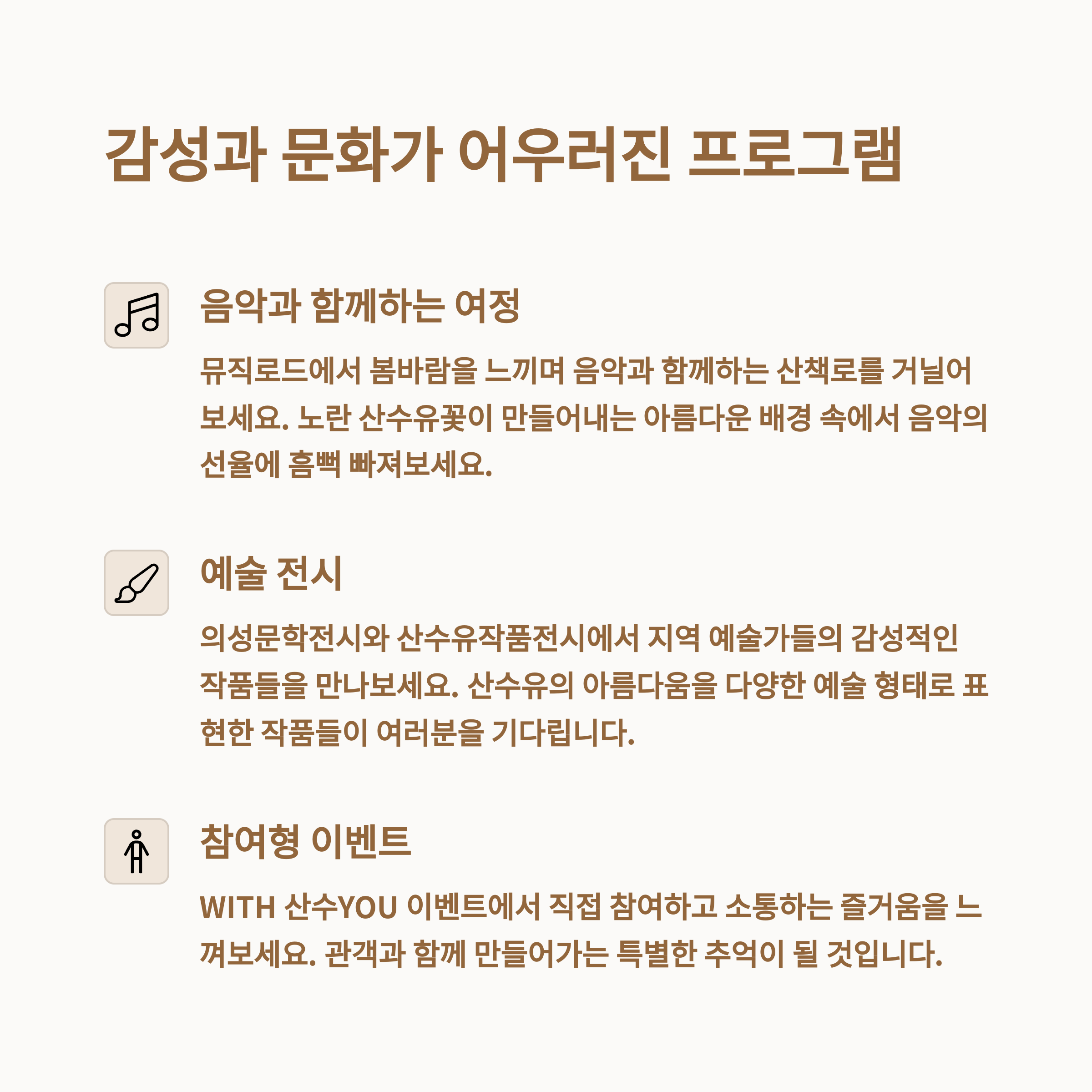 | 경북 의성군 사곡면 화전리 일원에서 개최 | 스템프 투어, 기념품 증정 등 참여형 콘텐츠 운영 | 봄바람과 함께하는 산수유길, 뮤직로드 등 테마길 |
