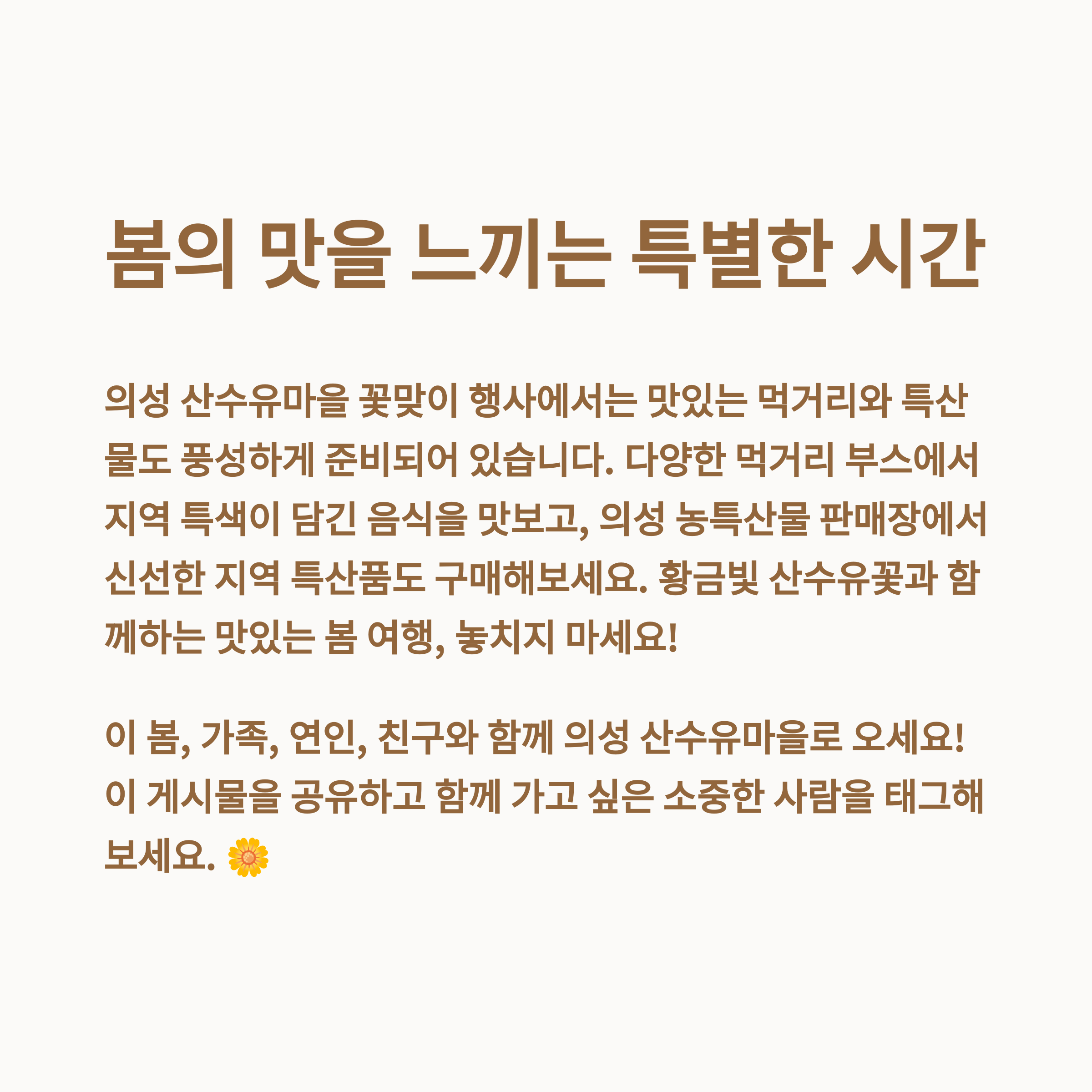 의성 산수유축제는 단순한 봄꽃 구경을 넘어서 지역 문화와 예술, 체험 프로그램이 어우러진 복합형 축제입니다. 자연 속에서의 여유, 가족과의 특별한 시간, 소중한 추억을 동시에 만들 수 있는 최고의 봄 축제라고 할 수 있습니다. 화창한 봄날, 따뜻한 햇살 아래 산수유꽃이 흐드러지게 핀 마을에서 여러분만의 특별한 이야기를 만들어보세요. 매년 기다려지는 이 아름다운 축제에서, 올봄의 첫 감동을 함께 경험해보시길 바랍니다.