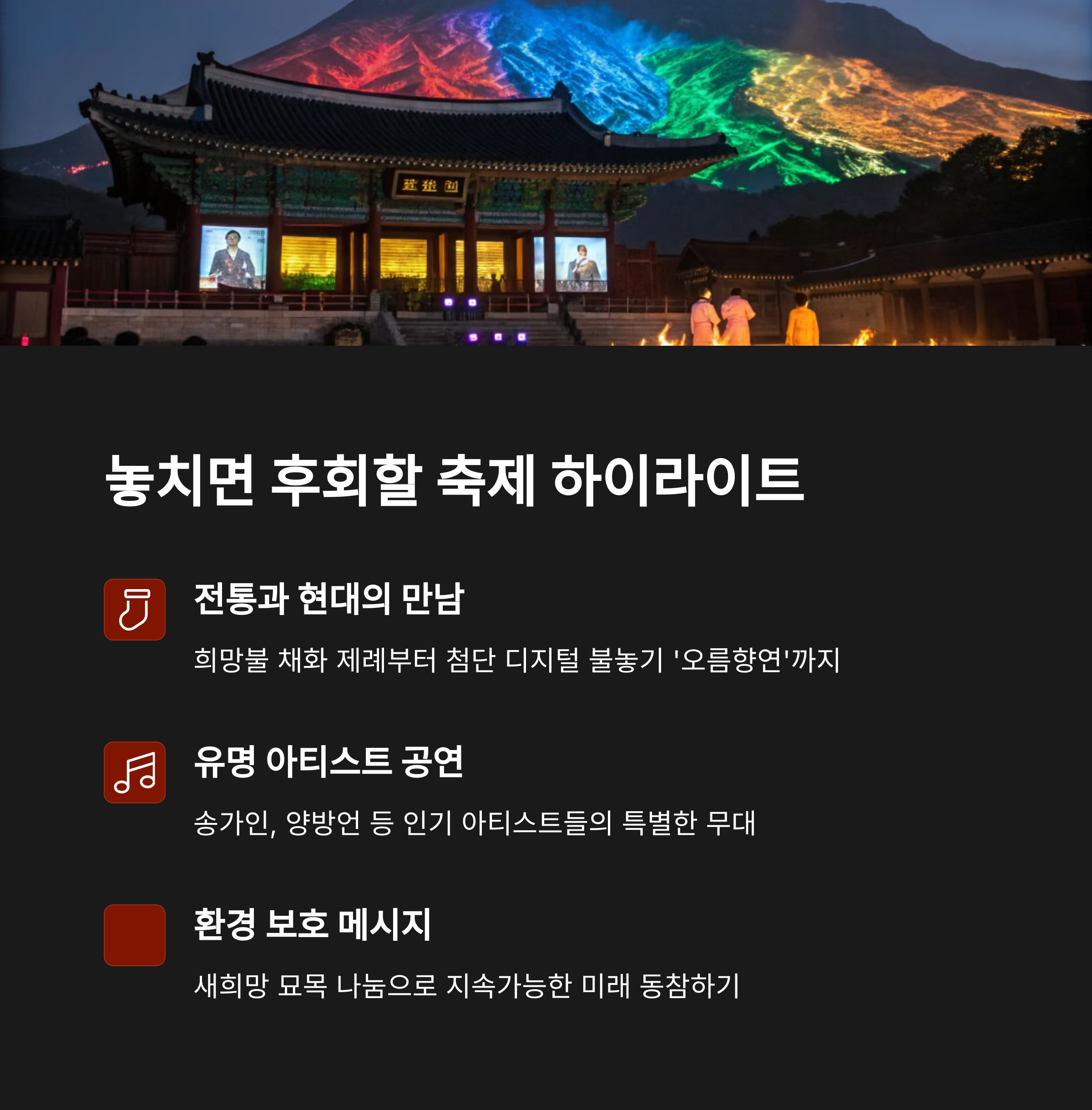 제주의 자연과 문화를 동시에 만날 수 있는 2025 제주 들불축제는 매년 많은 관광객이 찾는 대표적인 지역 축제입니다. 특히 새별오름을 무대로 펼쳐지는 이 축제는 제주의 정취를 오롯이 느낄 수 있는 특별한 경험을 선사합니다. 행사 첫날에는 희망불 채화 제례를 시작으로 개막공식행사와 송가인의 공연이 열려 축제 분위기를 한껏 끌어올립니다. 둘째 날에는 횃불대행진과 함께 디지털 불놓기 프로그램인 ‘오름향연’이 열리며, 전통적인 불축제에 현대 기술을 접목한 특별한 연출이 돋보입니다.