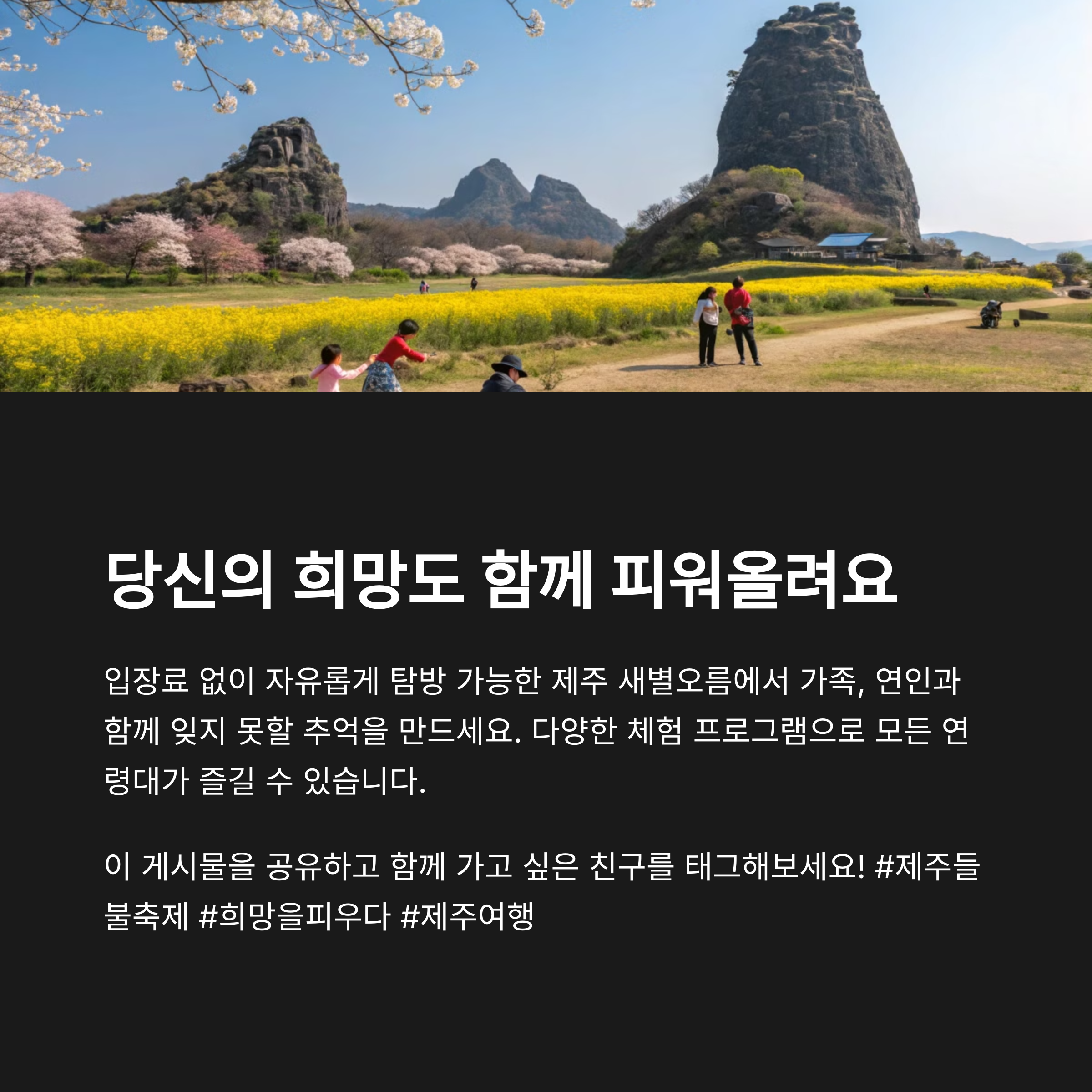 제주의 자연이 살아 숨 쉬는 새별오름에서 펼쳐지는 제주 들불축제. 전통을 현대적으로 재해석한 프로그램과 함께 따뜻한 봄을 맞이해보세요. 소중한 사람들과 함께 보내는 봄날, 문화와 자연이 함께하는 특별한 축제를 통해 마음속에 오래도록 남을 추억을 만들어보시길 바랍니다. 제주의 매력을 오롯이 담은 이번 축제는 단순한 관광을 넘어 자연, 사람, 문화가 함께하는 삶의 여유를 느낄 수 있는 소중한 시간이 될 것입니다.