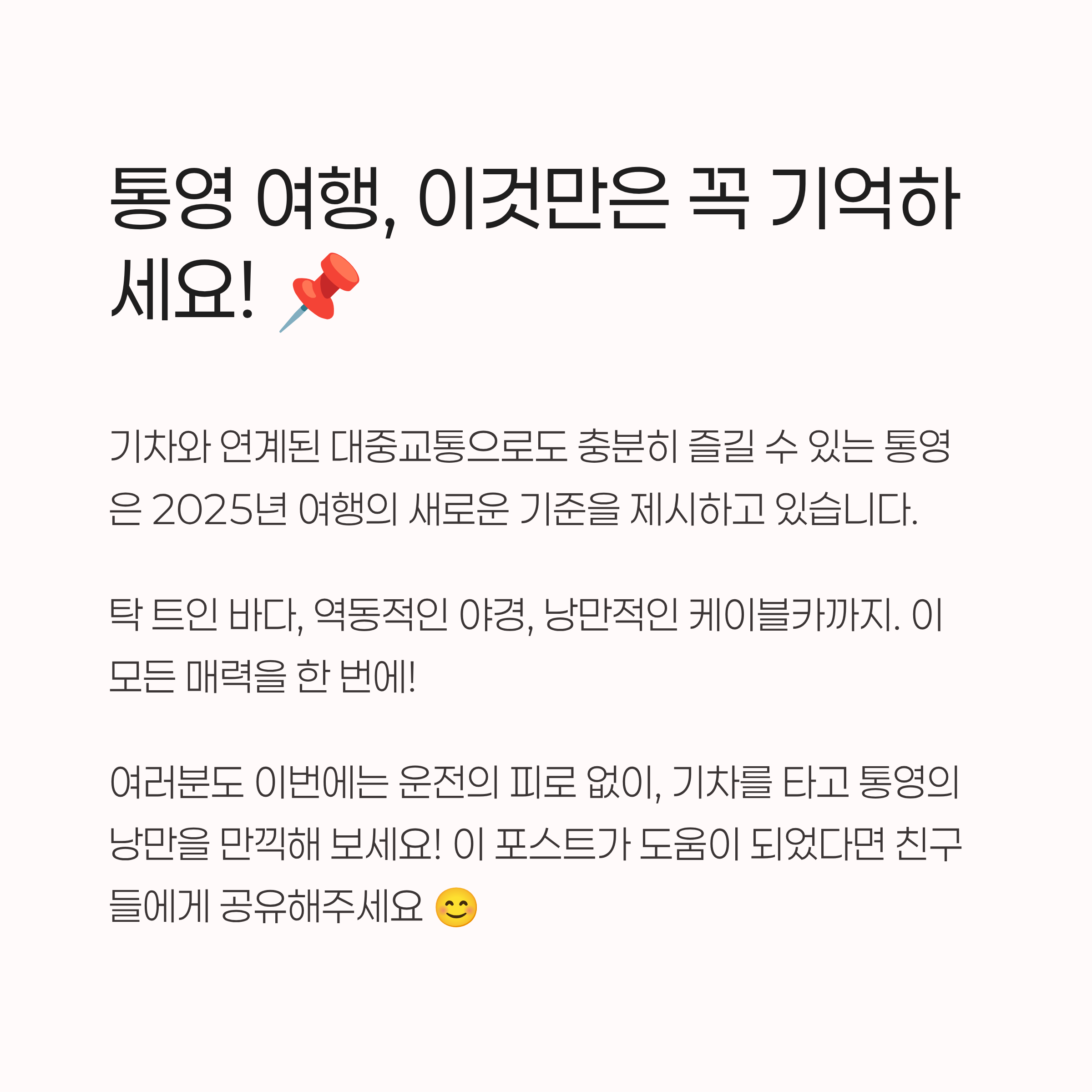 여러분도 이번에는 운전의 피로 없이, 기차를 타고 통영의 낭만을 만끽해 보시는 건 어떨까요? 통영의 밤이 선사하는 특별한 추억을 놓치지 마세요! 😊