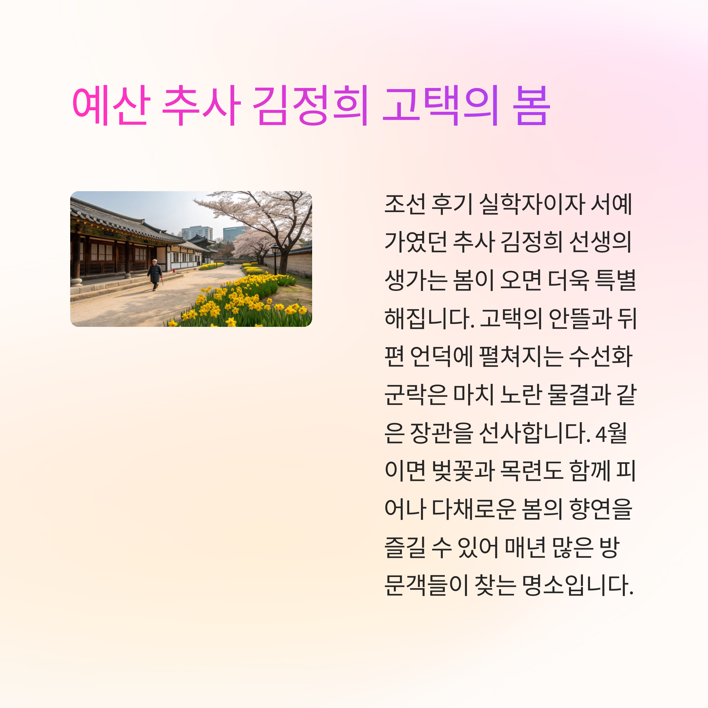 한국에서는 일제강점기 시대에 본격적으로 들어왔으며, 이후 많은 정원과 공원에 심어져 봄을 대표하는 꽃으로 자리 잡았습니다. 특히 유기방가옥과 같은 역사적 장소에서 감상하면 근현대 역사와 함께 봄의 아름다움을 더 깊이 느낄 수 있습니다.