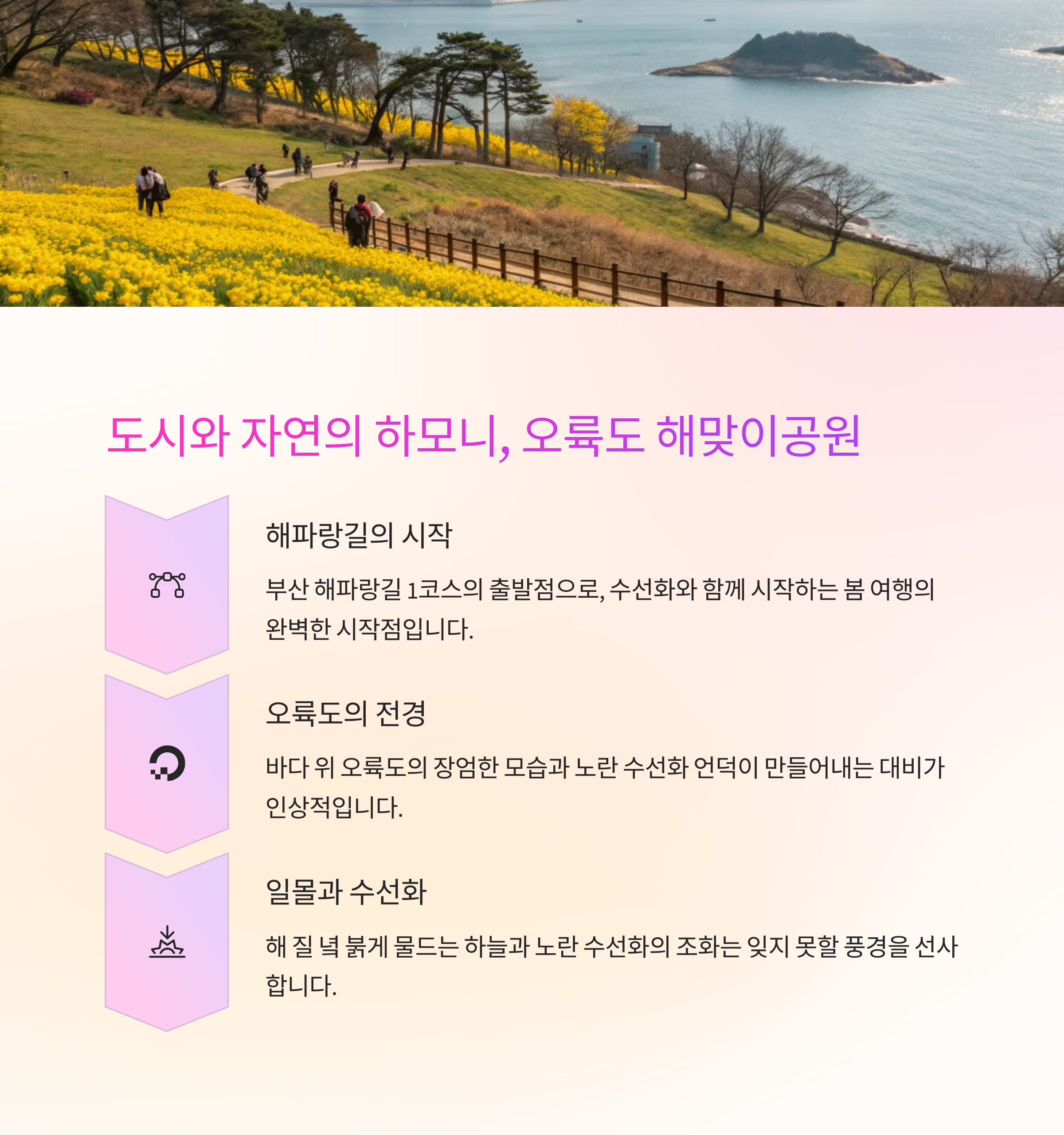부산 남구 용호동에 위치한 오륙도 해맞이공원은 해파랑길 1코스의 시작 지점으로, 봄철에 방문하기 좋은 부산의 대표적인 명소입니다. 이곳의 특별한 점은 바다 위에 떠 있는 오륙도의 전경과 노란 수선화 언덕이 어우러진 아름다운 풍경을 한눈에 감상할 수 있다는 것입니다.