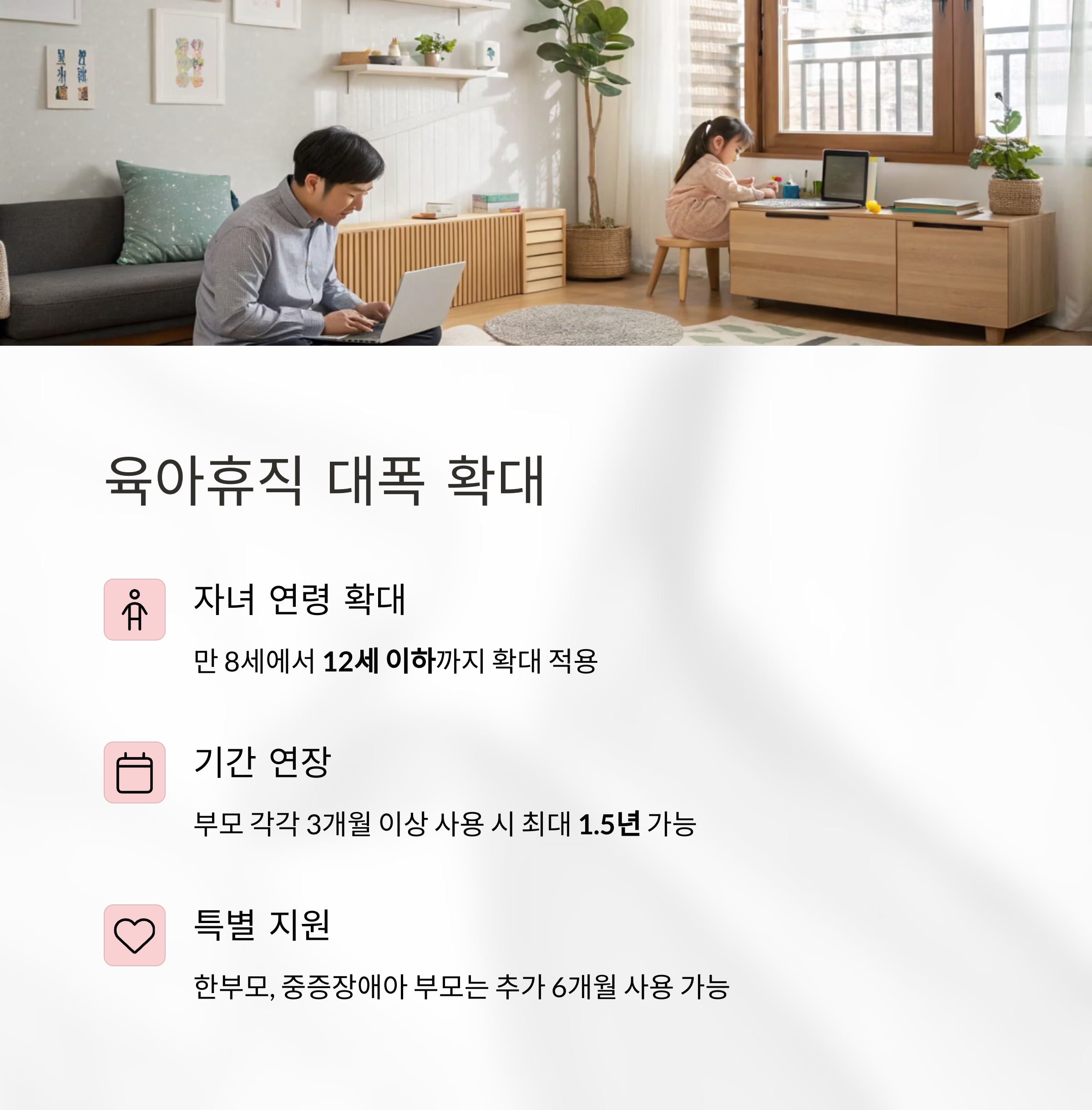 또한 신체적 또는 정신적 장애로 장기 치료가 필요한 자녀를 둔 학생의 경우, 자녀가 16세 이하이거나 중학교 1학년 이하인 경우까지 휴직 자격 기준이 상향 조정되었습니다. 이 개혁은 학업과 육아 책임을 동시에 수행하는 학생들에게 더 유연한 지원을 제공하기 위한 정부의 노력의 일환입니다.