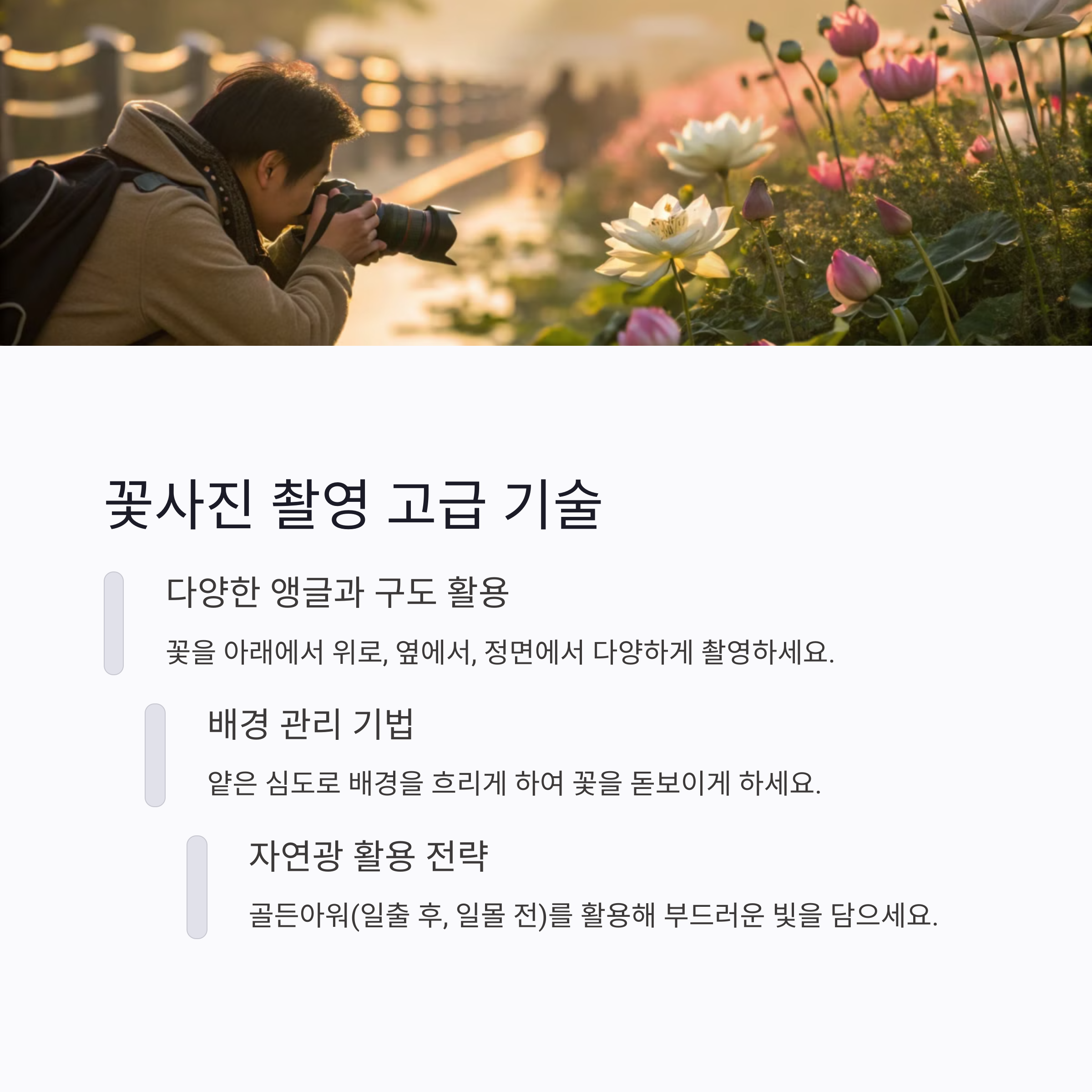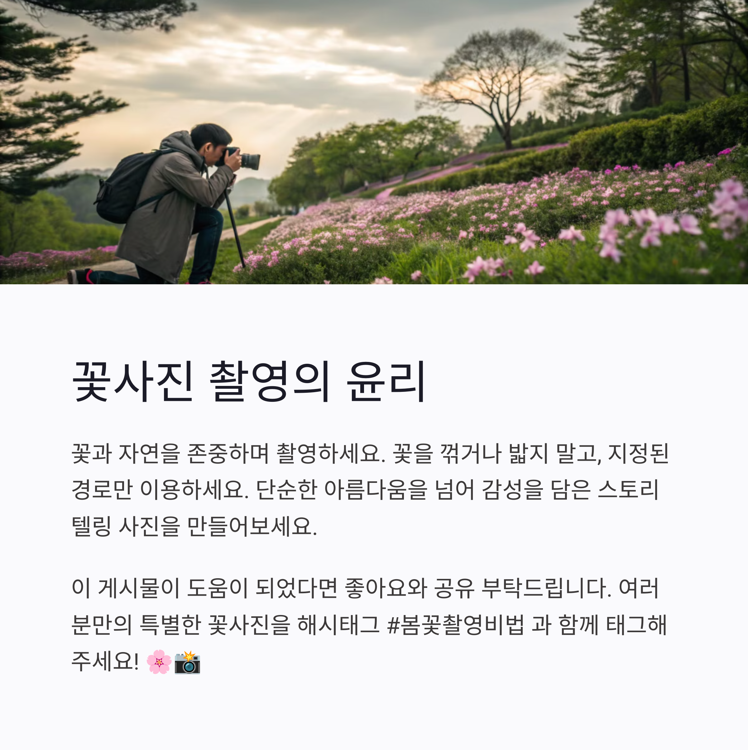 이 글에서 소개한 명소들과 팁을 활용해 올 봄, 잊지 못할 꽃사진을 남겨보세요. 그리고 여러분만의 특별한 꽃사진 명소나 촬영 팁이 있다면 댓글로 공유해 주세요!