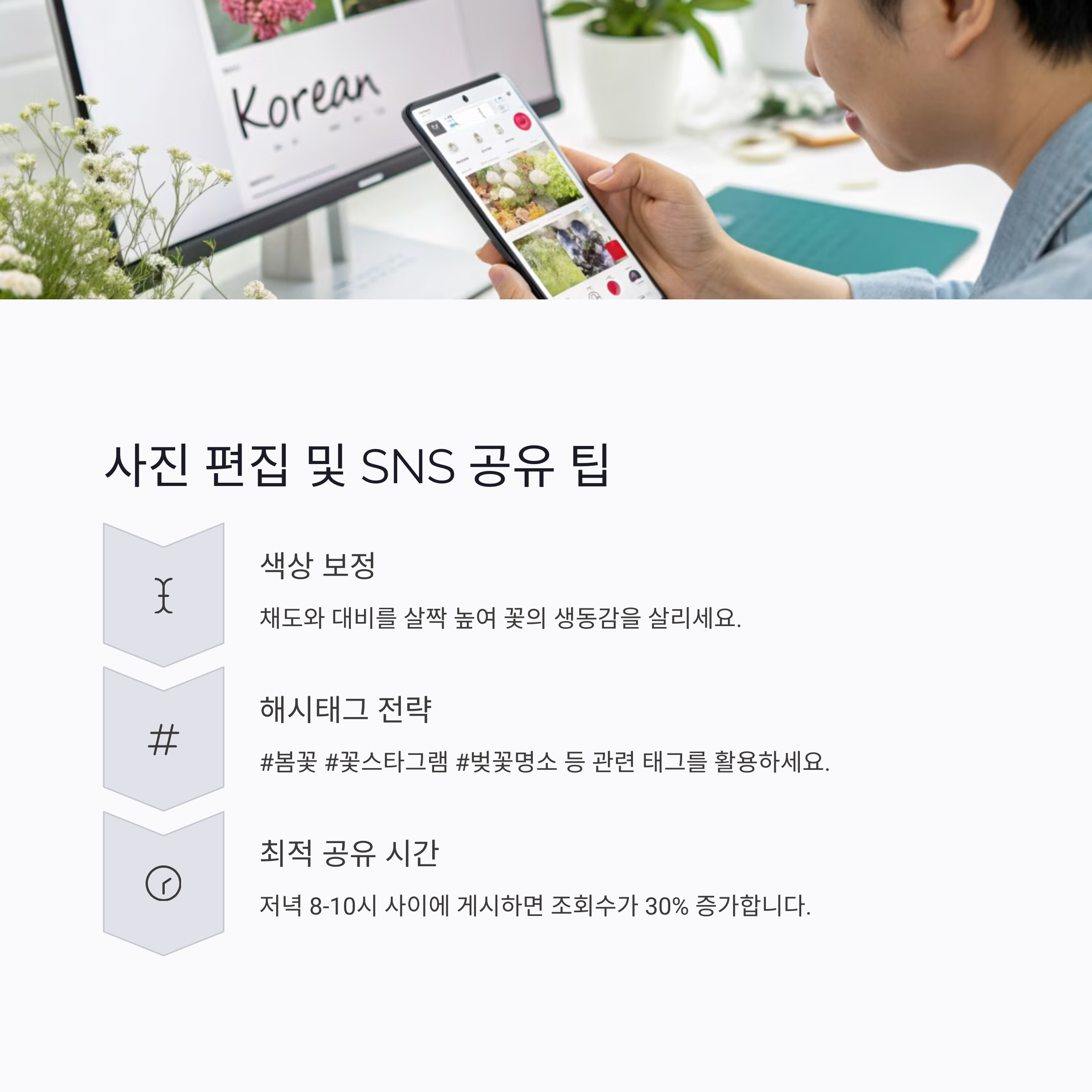 - 해시태그 예시: #서울벚꽃 #4월꽃 #자연사진 #꽃사진
