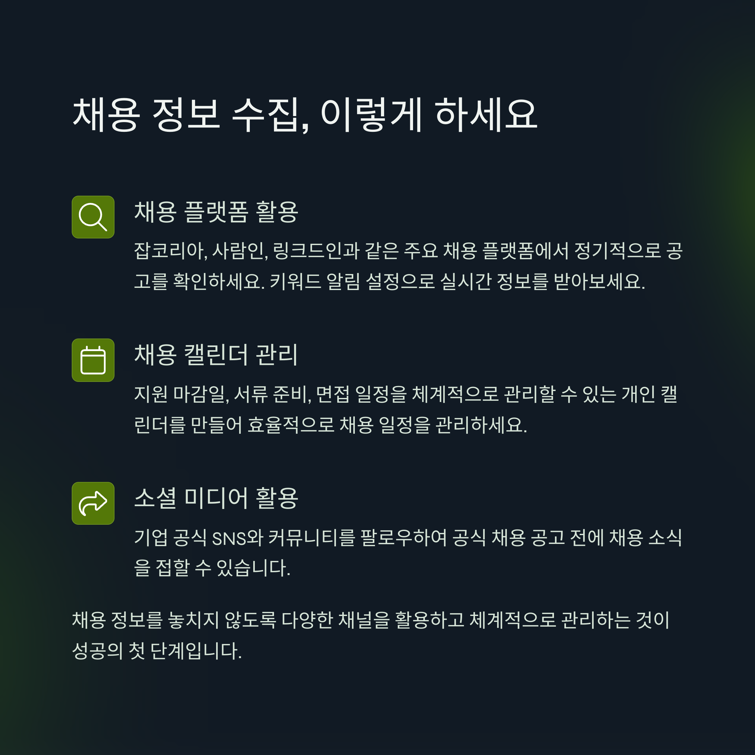- 기업 채용 페이지: 관심 있는 기업의 채용 페이지를 직접 방문하여 최신 채용 공고를 확인하세요.