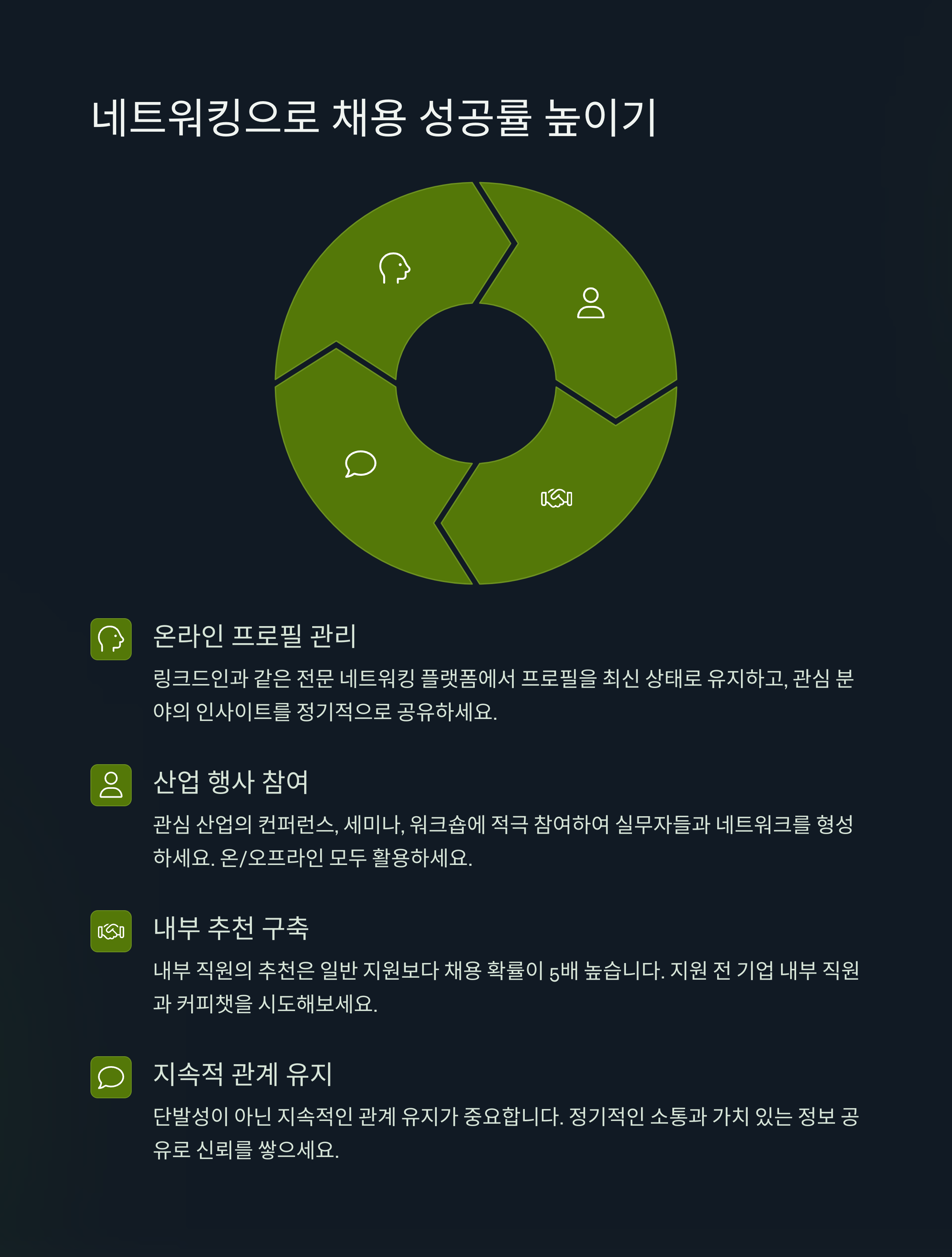 - 지속적인 네트워킹: 채용 시즌이 끝나도 네트워킹을 유지하세요.
