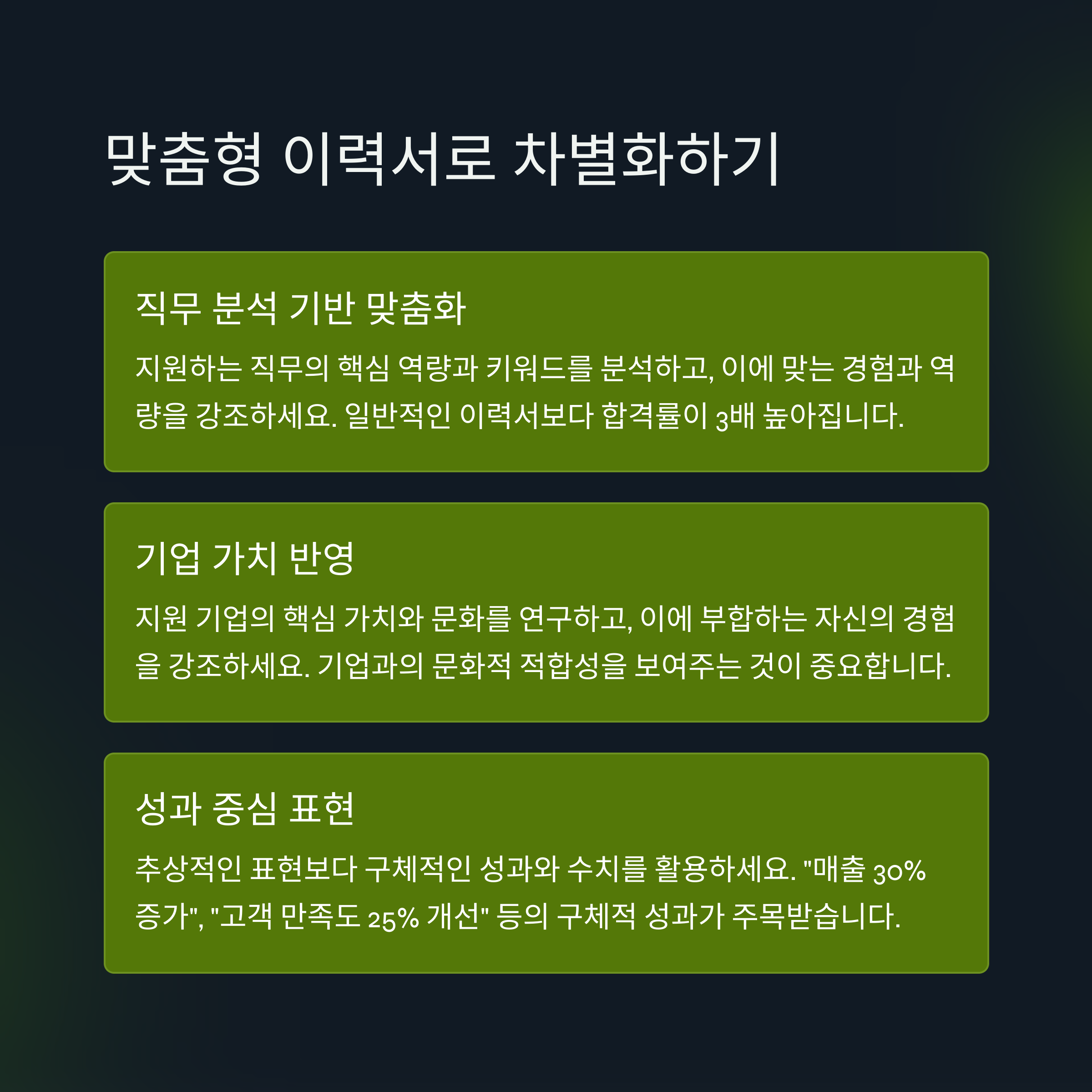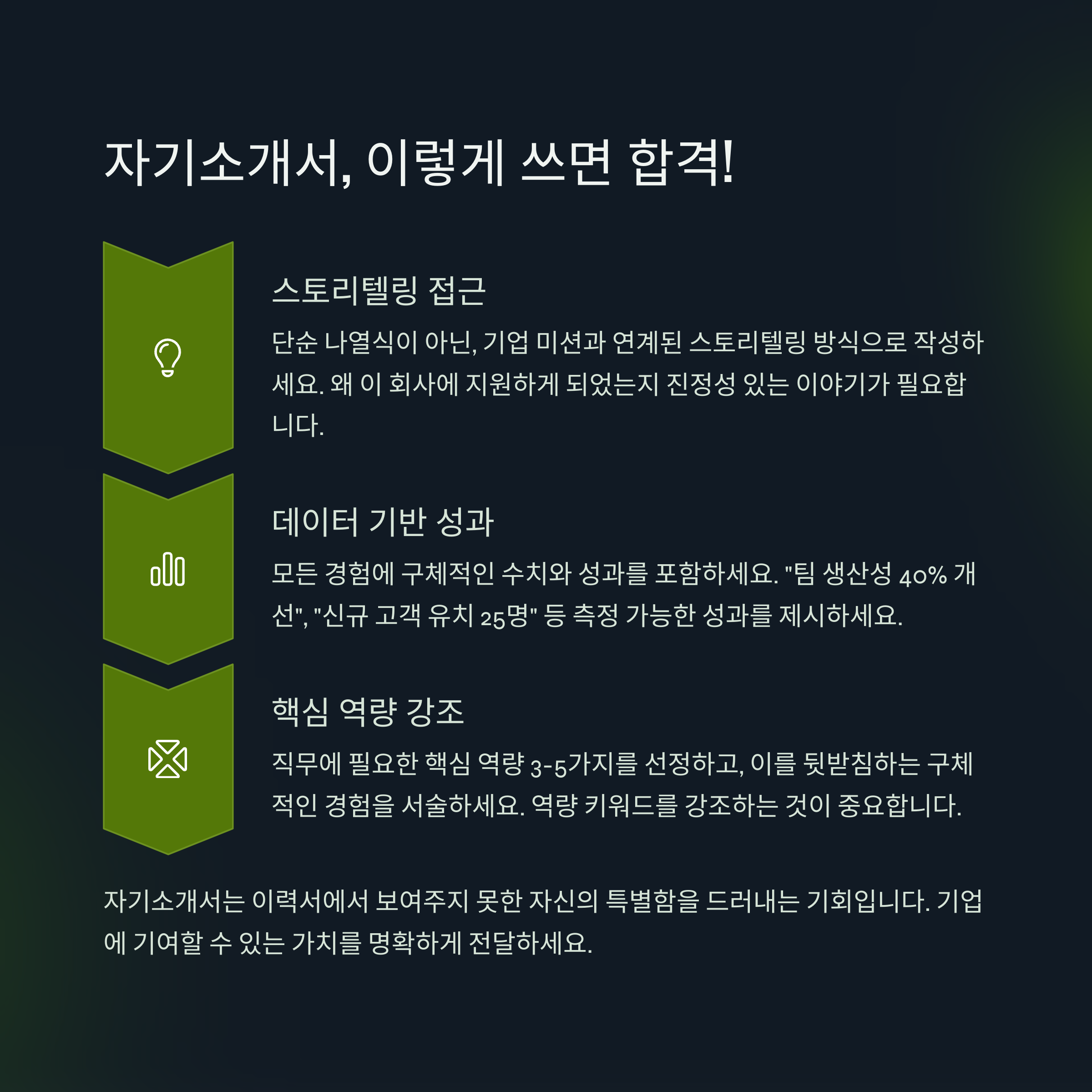 - 맞춤형 자기소개서: 각 기업의 문화와 가치에 맞게 자기소개서를 작성하세요.
