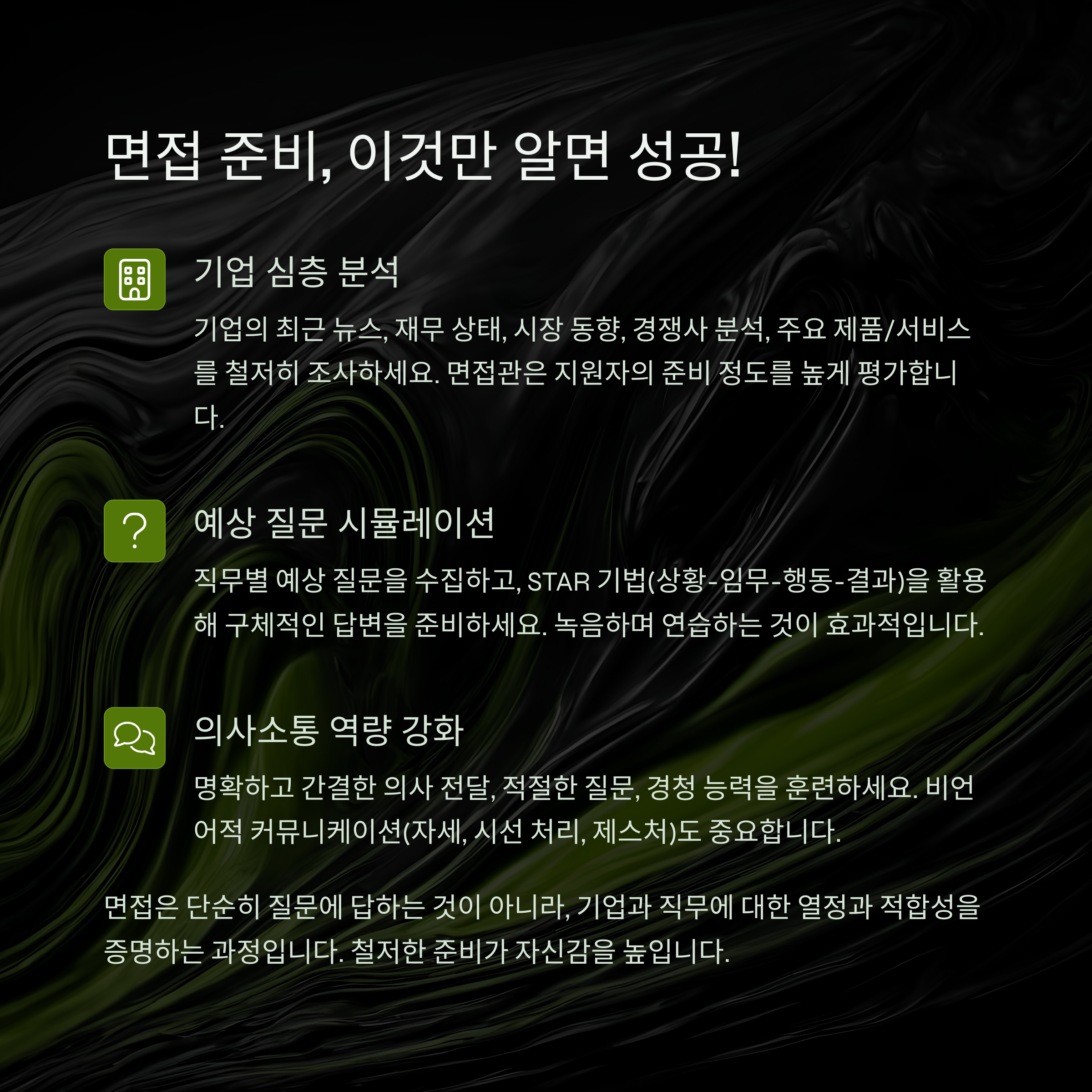 - 예상 질문 준비: 직무와 관련된 예상 질문들을 준비하고, STAR 방식(상황-과제-행동-결과)으로 답변을 구성해보세요.